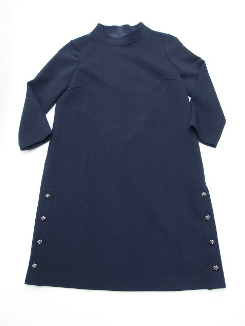 商品名 | カメリア飾りボタン ハイネック ワンピース ネイビー(紺) モックネック バッグファスナー 七分袖 膝丈 サイズ36 Mサイズ 無地 レディース |