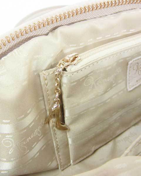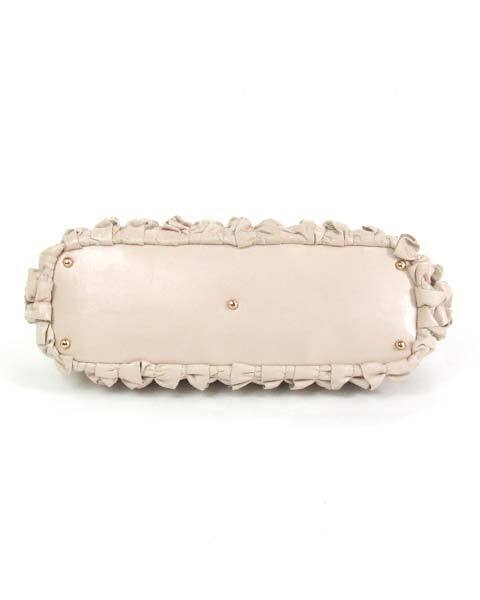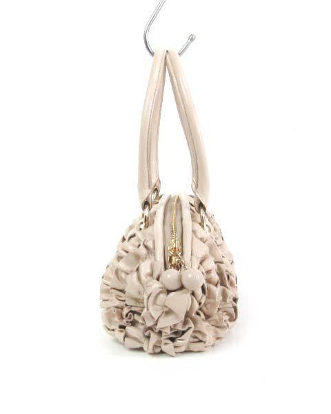 たっぷりフリルが大人かわいい♪チャーム付きバッグ☆光沢のある落ち着いたベージュで、甘めデザインも品よく♪しっかりめのマチと大きく開くドーム型のファスナー開閉で、小ぶりながら収納力があり、中身も見やすく実用的です。丸いキャンディーのようなファスナー引き手がキュートですね。内側オープンポケット×1、ファスナーポケット×1仕様です。 |