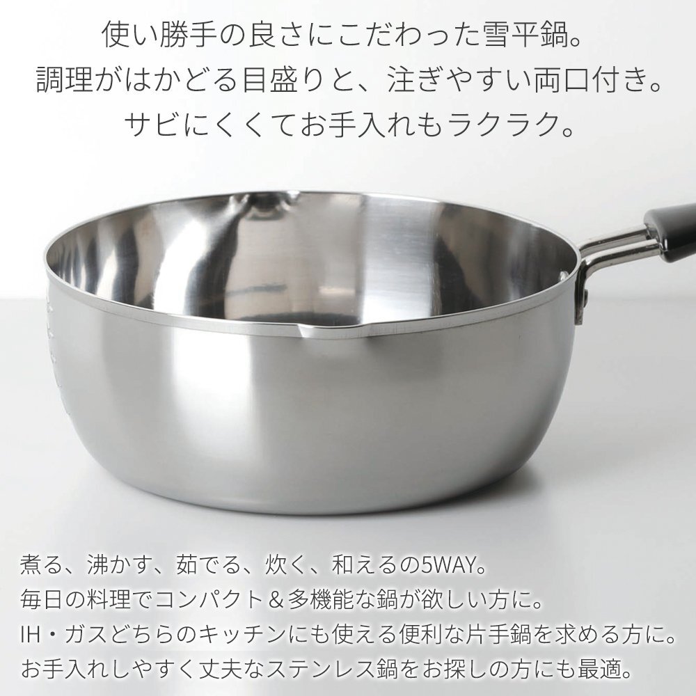 | 煮る、沸かす、茹でる、炊く、和えるの5WAY! 日常使いに便利な軽量ステンレス鍋。 | |