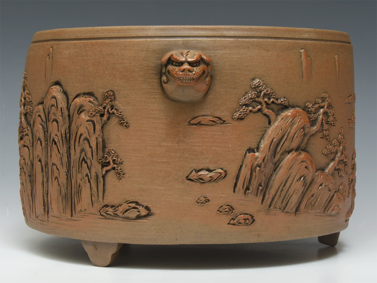 滑らかな胎土に、峻険な山並みと静かな楼閣が立体的に刻まれた瓶掛です。 細密な山水彫は、景色の奥行きを巧みに表現し、周囲を巡るように眺める楽しさがあります。 側面には獅子耳が配され、造形の力強さと品格を添えております。 素朴な土味と彫技が調和し、火まわりの道具としてはもちろん、観賞用としても映える一品です。 目立ったダメージ等なくコンディションは良好です。 ※予めご了承の上ご入札お待ちしております。 ※撮影の際に生じた写り込みなどがございます。 ご理解の程よろしくお願い致します。 |