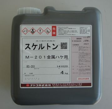 | 特徴 塩基性(アルカリタイプ)で剥離力が強力です 用途 自動車、重車輌、機械、橋梁、金属製品などの旧塗膜の剥離や、 ガソリンスタンド建築内外装、プールなどの再塗装等 使用方法・注意事項 1.冬季は使用前によく振ってください 2.刷毛で旧塗膜に対して均一に塗ってください (塗布量は1m2あたり400~500グラムが標準です) 3.旧塗膜の種類や状態によって差異がありますが 5~15分ほどで旧塗膜が浮き上がってきます (ラッカー系等の塗膜は溶解した状態になります) 4.旧塗膜をスクレーパー等で除去します。旧塗膜の 膜厚によってはスケルトンが素地まで浸透しない場合が あります。その場合は塗布を繰り返してください 5.剥離作業のあと水洗してください *本商品は直接肌や目に触れると大変に危険です! 取扱い時は必ず、ゴム手袋・ゴーグル等の保護具を装着してください 夏場等に容器が膨らんでダルマ状になっている場合はフタを開けた際に 中身が噴出することがあります。容器を冷水に30分程度浸してから ゆっくりと開栓してください。 |