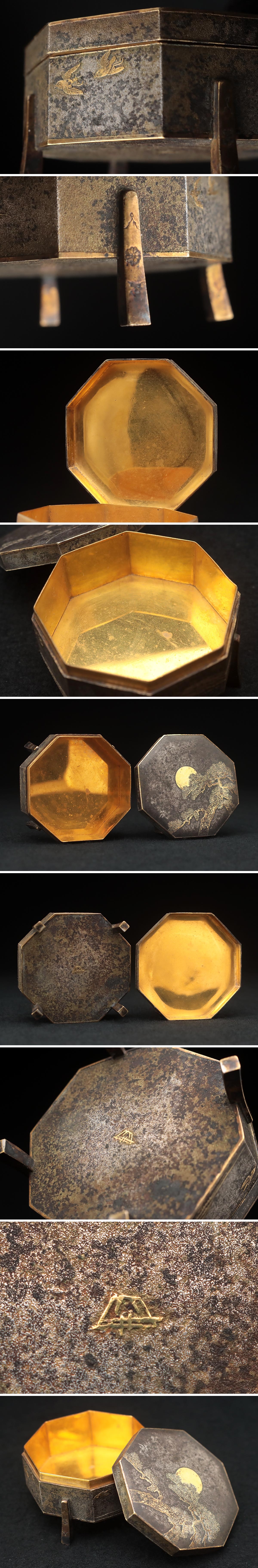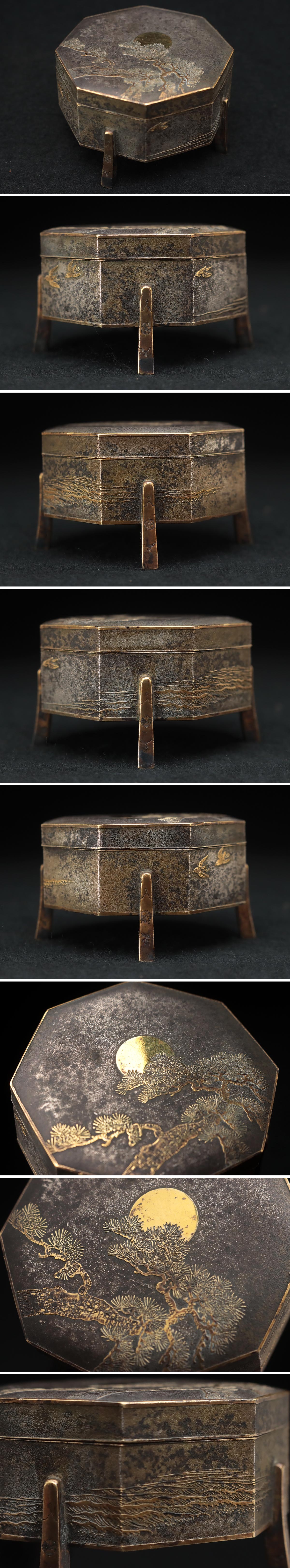 | ◆ 時代【富士井製】朧銀金象嵌 内金 月松静波千鳥図 六角行器形 ボンボニエール 幅6.8cm・象嵌菓子器 茶道具 金工古美術 ◆