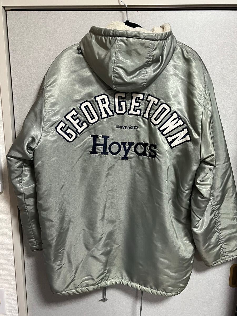 こちらの商品は、Georgetown universityのフード付中綿ナイロンベンチコートになります。カラーはグレーで、ワッペンやバックロゴプリントを施したのベンチコートになります。