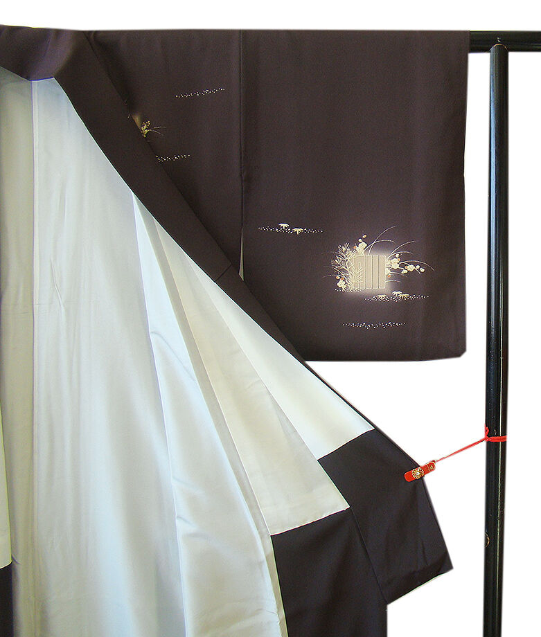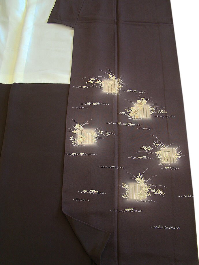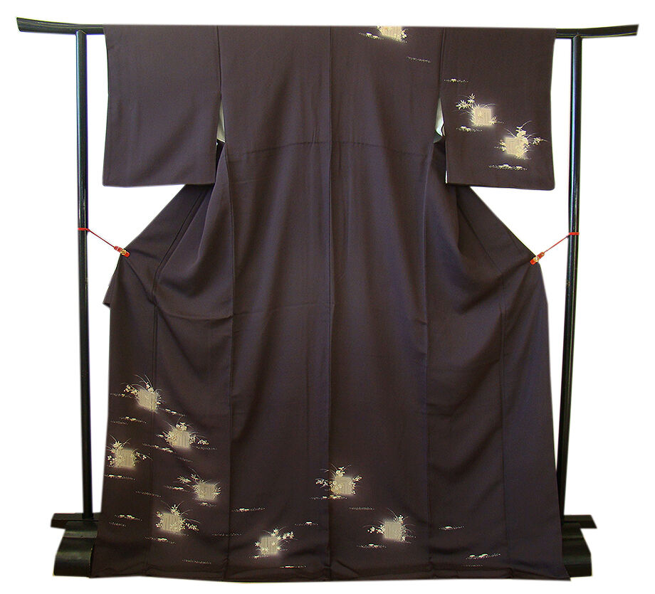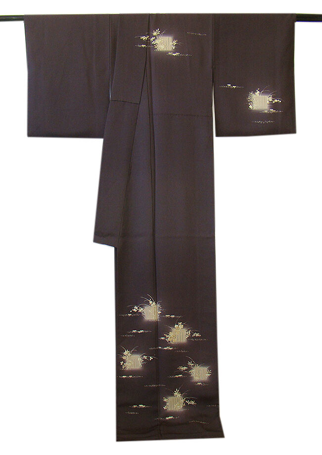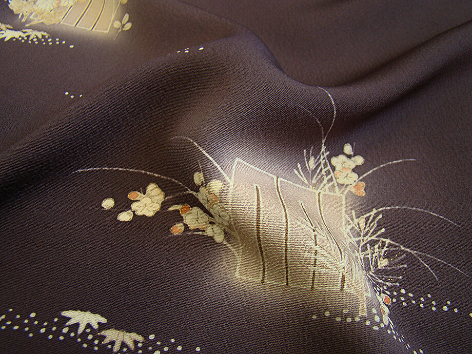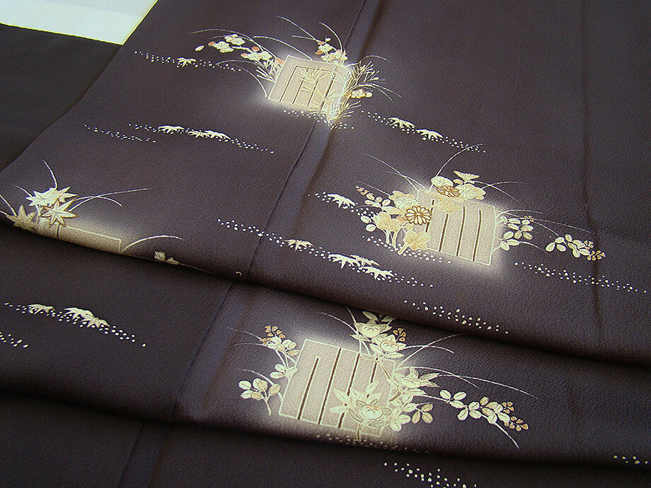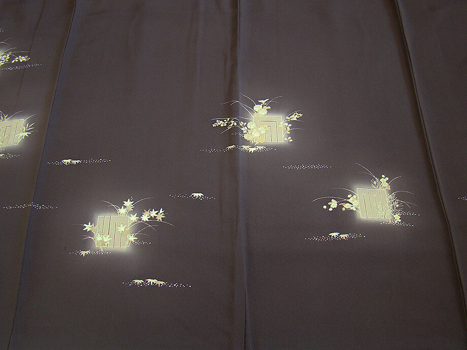 商品説明 | こちらのお品は「袷」ですので10月から5月までお召頂ければと思います。 しなやかで柔らかな手触りの着心地良いぽってりとした重めの極上ちりめん地の生地、 渋い黒紅色地に源氏香、四季の花木柄の染柄に金彩加工仕立て、 八掛は共布(正絹)、幅広い年代の方にお召頂けます。 |