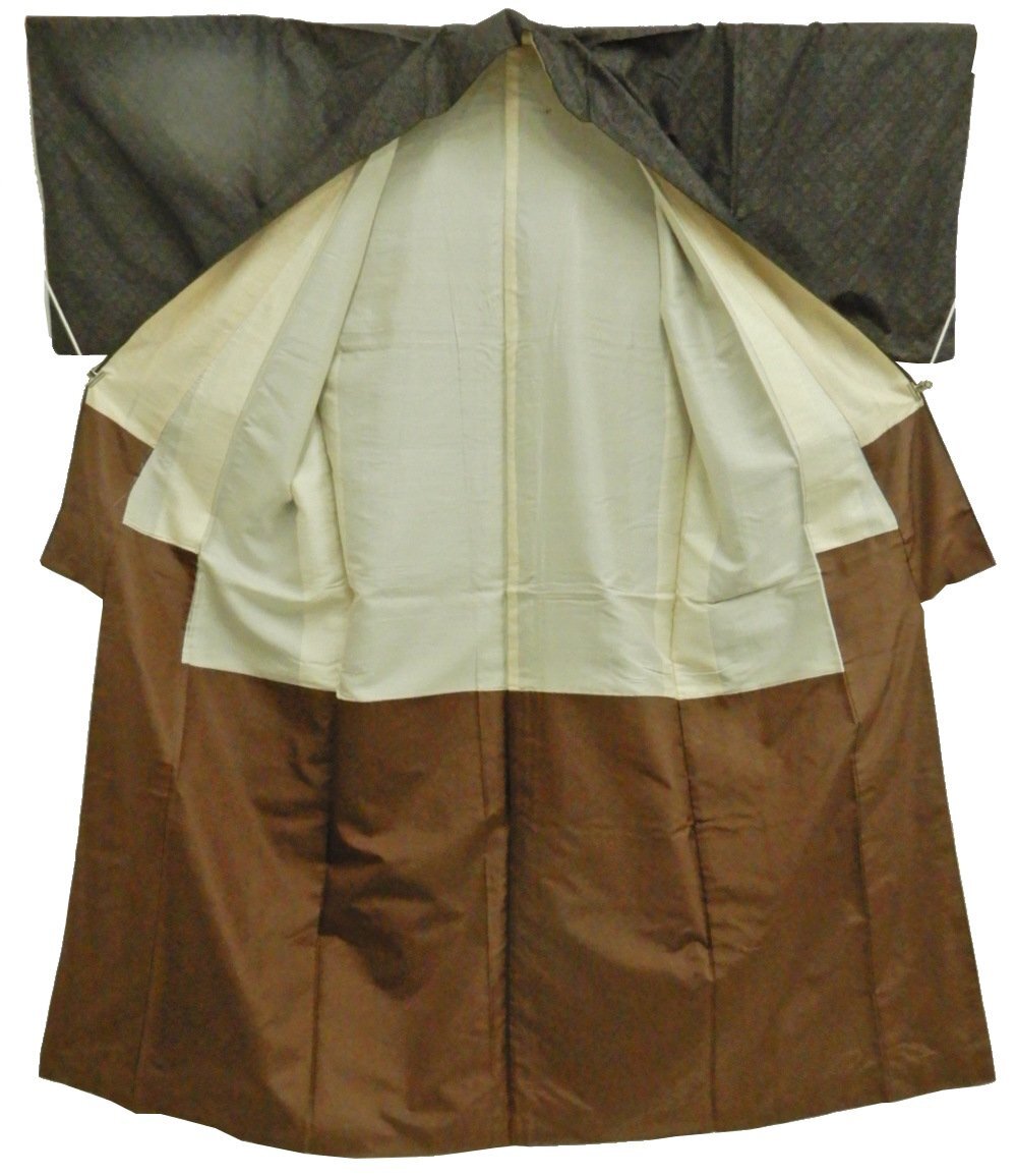 【シミ汚れ箇所】 胴裏全体に黄変と汚れがあります。 衿裏全体、袖裏全体に黄変があります。 八掛に白っぽい汚れがあります。 その他は、よい状態のお品です。 |