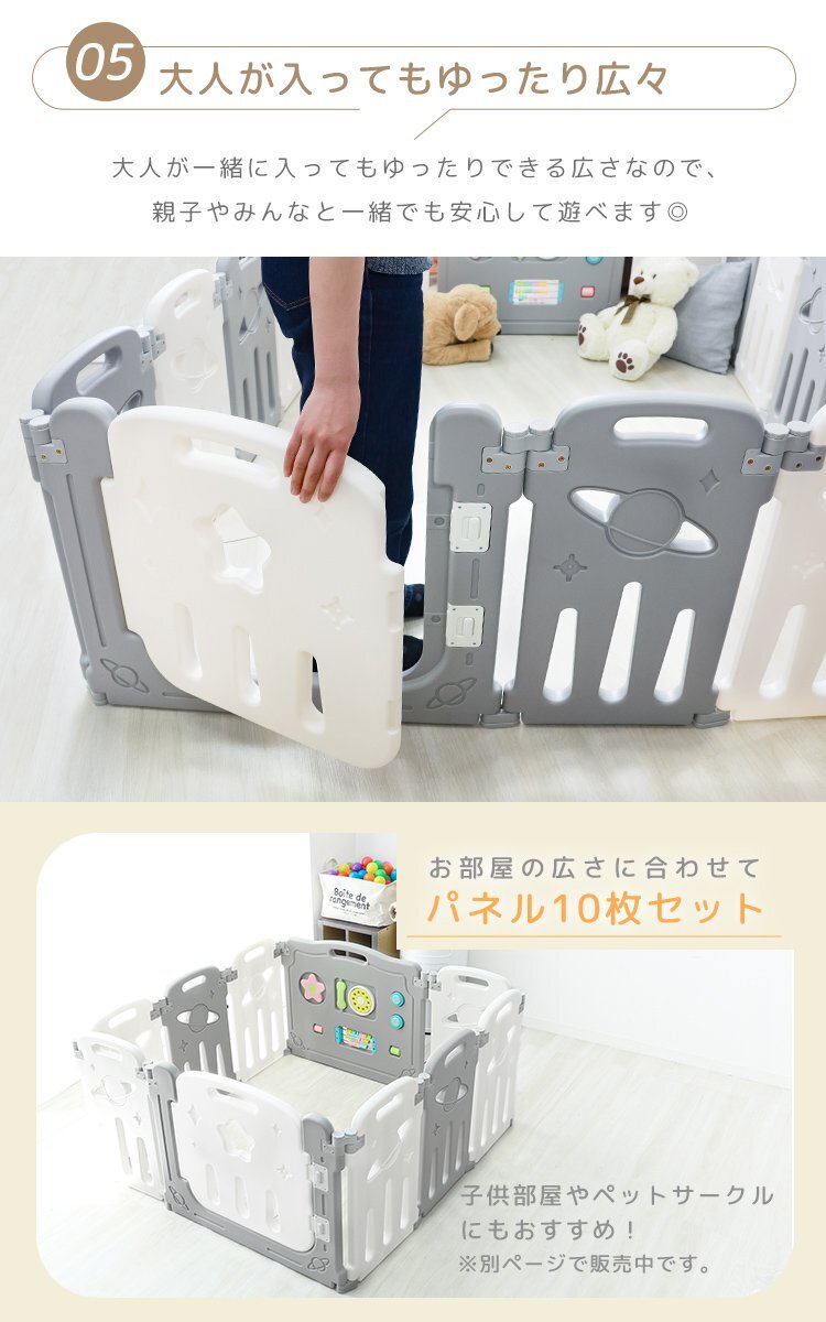 お子様に安全な軽くて柔らかい素材と丸みを帯びたデザイン! ママにも簡単に組み立てられるベビーサークルです。 赤ちゃんの脳の発達を助けるトイパネルも付いています。 工具不要で組み立て簡単! お好みの形に広げて接続部分のキャップを締めて固定するだけ! 外側から扉をロックすることができるので、お子様が勝手に外へ出てしまう危険性がありません。 お手入れはサッと拭くだけ! 組み立てたまま拭けるのでお手入れも簡単! いつでも清潔を保てます。 また、当店人気商品の プレイマット や ジョイントマット カラーボール との組み合わせも相性抜群です★ 【商品仕様】 こちらは16枚セット/ホワイトの商品ページとなります 内容:おもちゃパネル×1、扉パネル×1、パネル×14 対象年齢:6ヶ月から8歳頃まで 素材:ポリエチレン 【注意事項】 ・本製品の組み立て、設置は、必ず保護者の方が正しく行ってください。 ・必ず保護者のもとでご使用し、お子様の行動には十分ご注意ください。 ・暖房機器や火気の近く、または屋外では使用しないでください。破損や変形の原因となります。 ・パネル縁、柵の隙間の処理時、カッターでのバリ処理を行っております。 その為、バリ処理跡やへこみなどがある場合がございます。 こちらは製造上発生する跡の為、跡の状況によってはご返品、交換のご対応ができない場合がございます。 バリ処理には細心の注意を払っておりますが、万が一バリを見つけられた場合は、カッターで削り処理をお願い致します。 ・イメージ違い、お子様がかじるなどでのご交換、返品はできかねます。予めご了承ください。 ・商品は、モニターによって色合いが異なって見える場合があります。 ・仕様・デザインは改良のため予告なく変更することがあります。 |