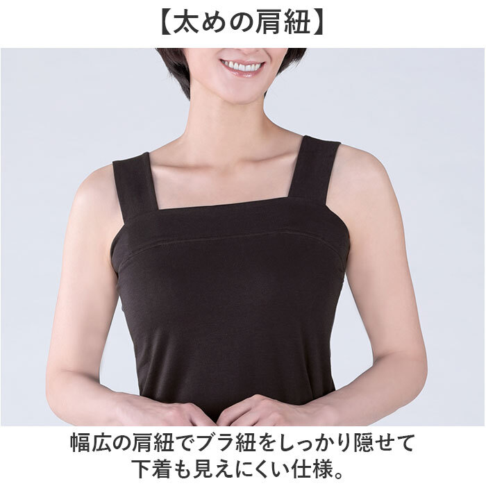 | 商品説明 | ・・【ブラ紐&胸元見えない】 ・胸元と脇に優しくフィットして袖口からのチラ見えを防いでくれるタンクトップ◎ ・【動いても安心】 ・腕を上げても前かがみになっても浮きにくい安定した着心地〇 ・【太めの肩紐】 ・幅広の肩紐でブラ紐をしっかり隠せて下着も見えにくい仕様。 ・【快適な着心地】 ・吸汗性に優れた綿100%生地を使用し、優しい肌触り♪ ・【着回し自在】 ・インナーにも単品にも使える万能タンクトップ! |