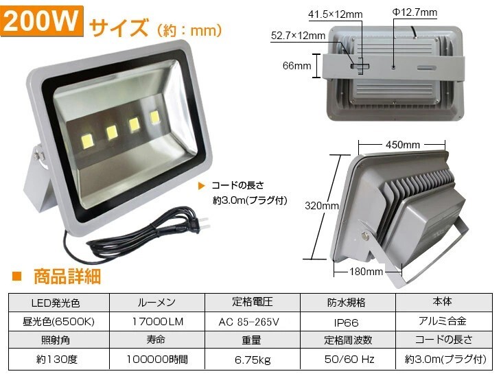 LED採用の省エネ投光器ライトです。200Wと省電力で、従来の2000W相当の明るさです!
