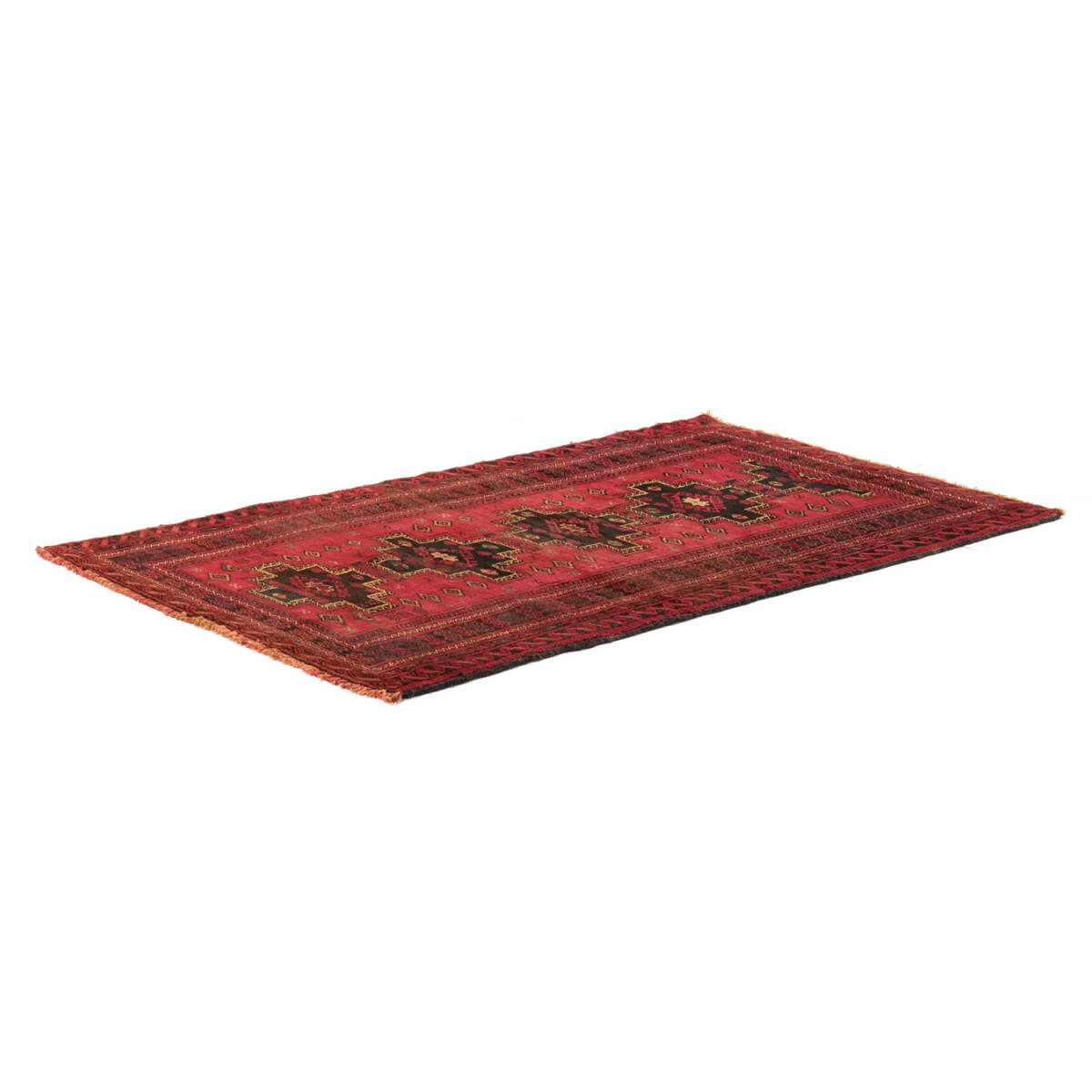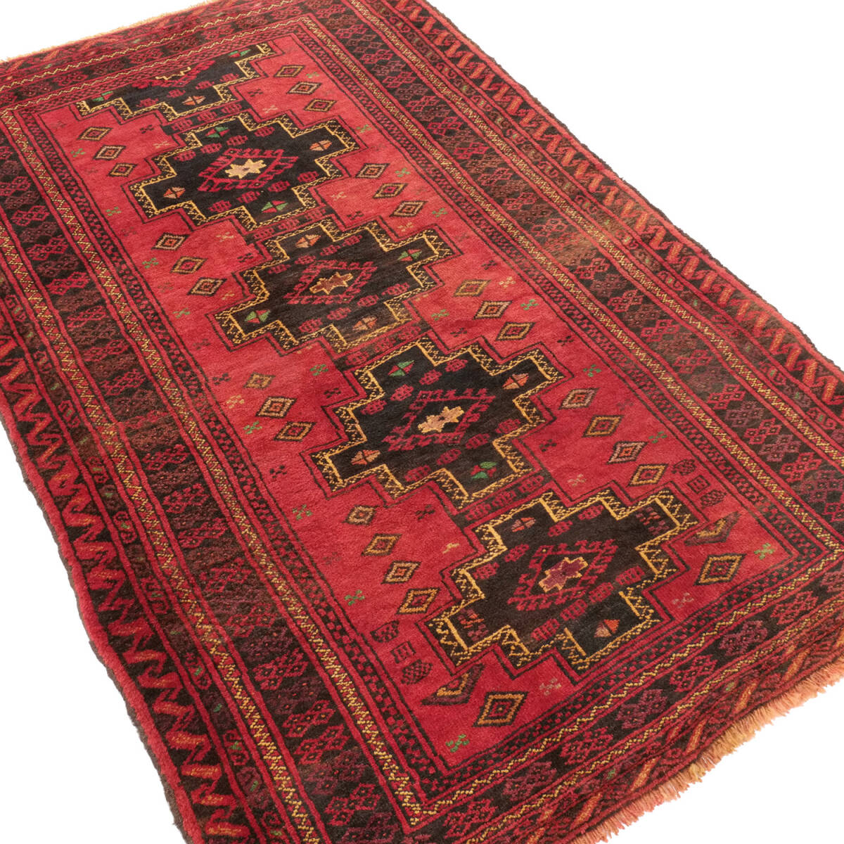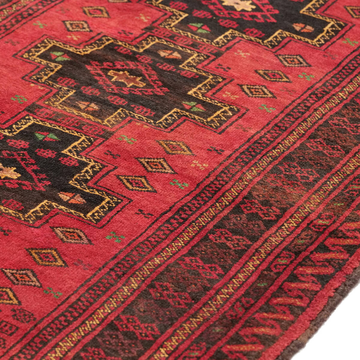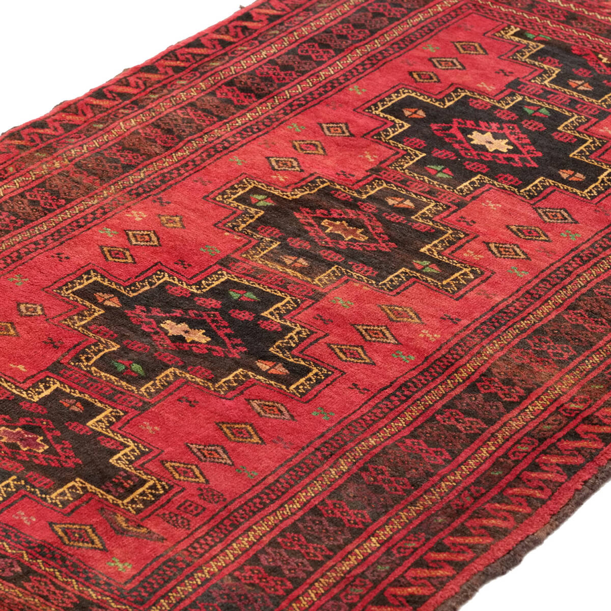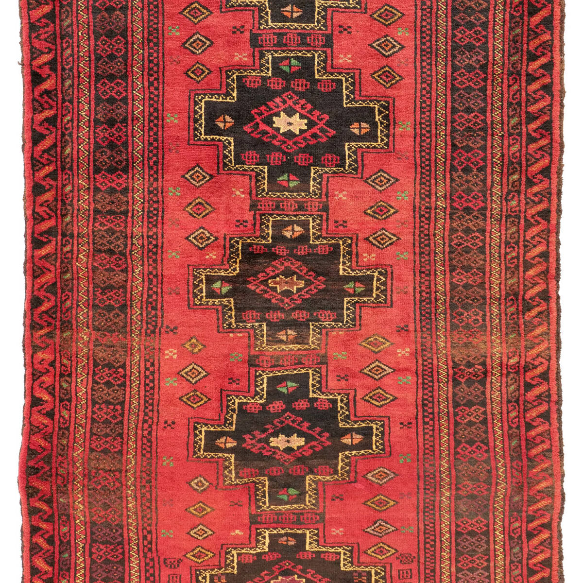 階段状の縁を持つ「ステップド・クロスメダリオン」を中央に配した伝統構図。サラフス地方特有の織りの緻密さと、整然とした美的感覚が調和しています。1970年代のセミアンティークとして、部族美と均整美を併せ持つ上質な作品です。