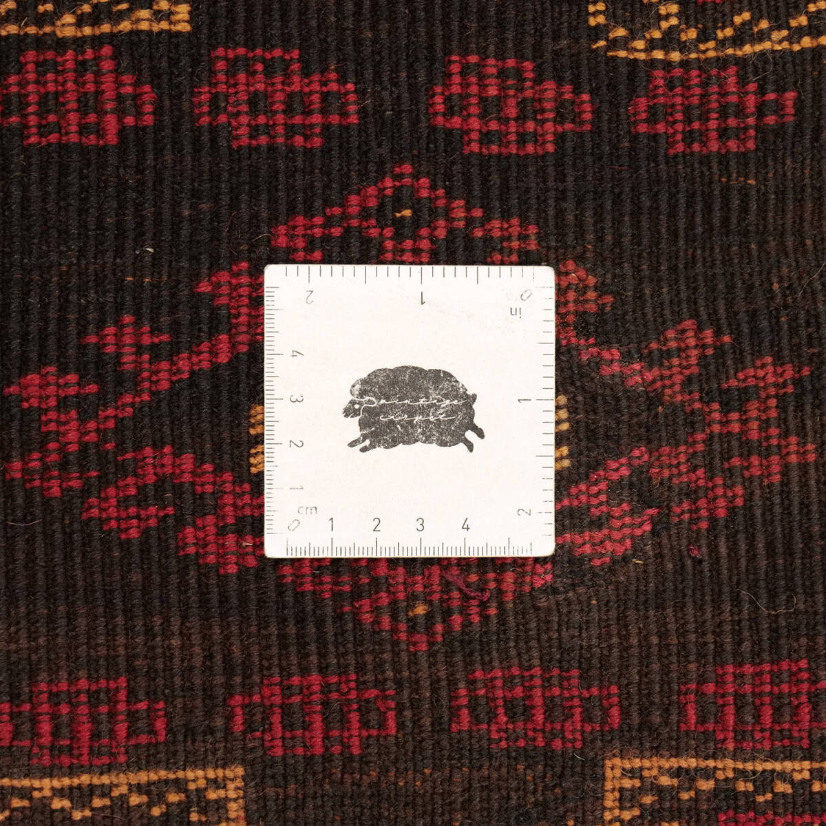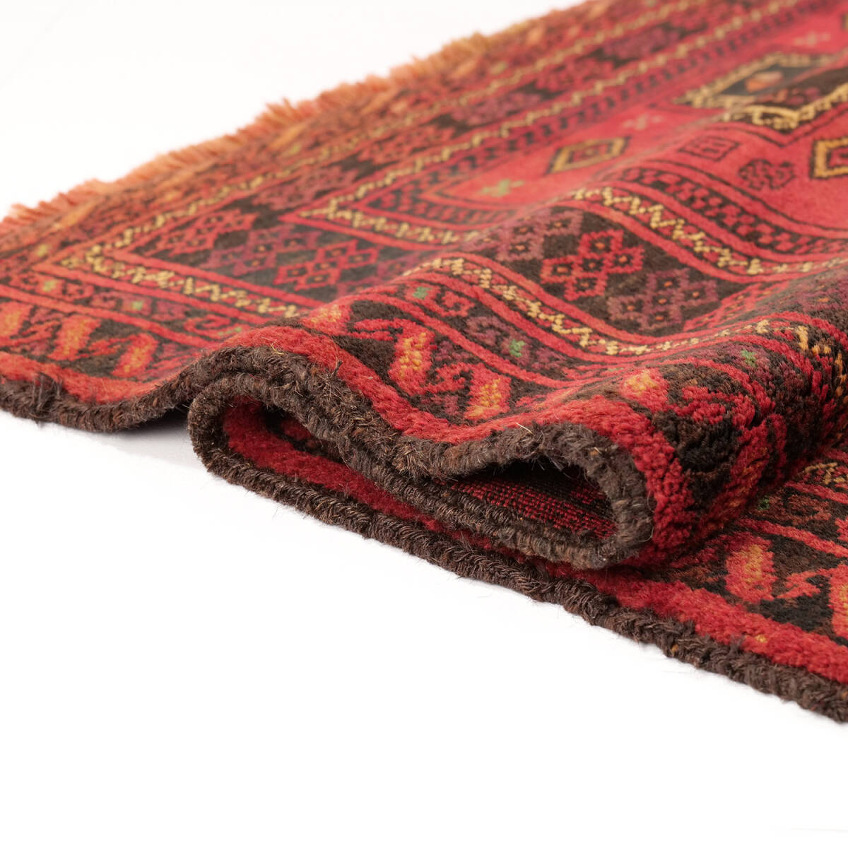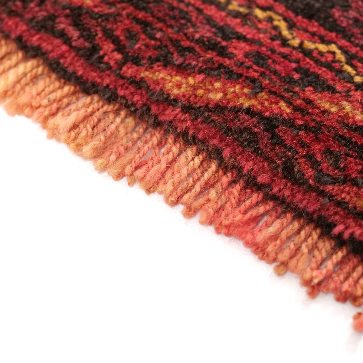 赤を基調に黒と黄のコントラストが美しく映え、細部まで精緻に織り込まれています。経年による柔らかな艶が生まれ、セミアンティークならではの深い表情を備えています。織りはしっかりと密で、しなやかさと重厚さを併せ持つ質感です。
