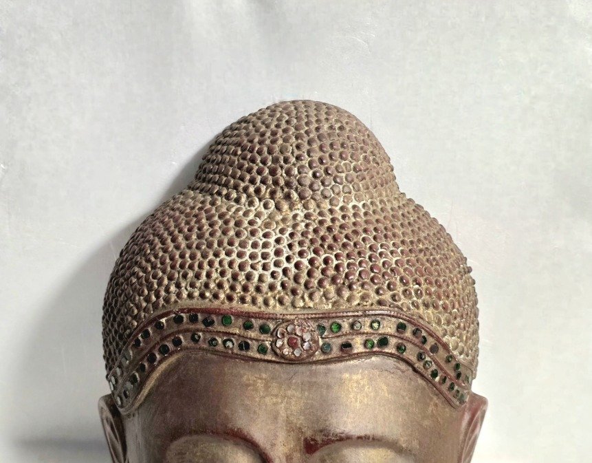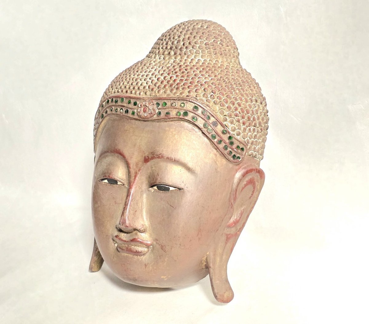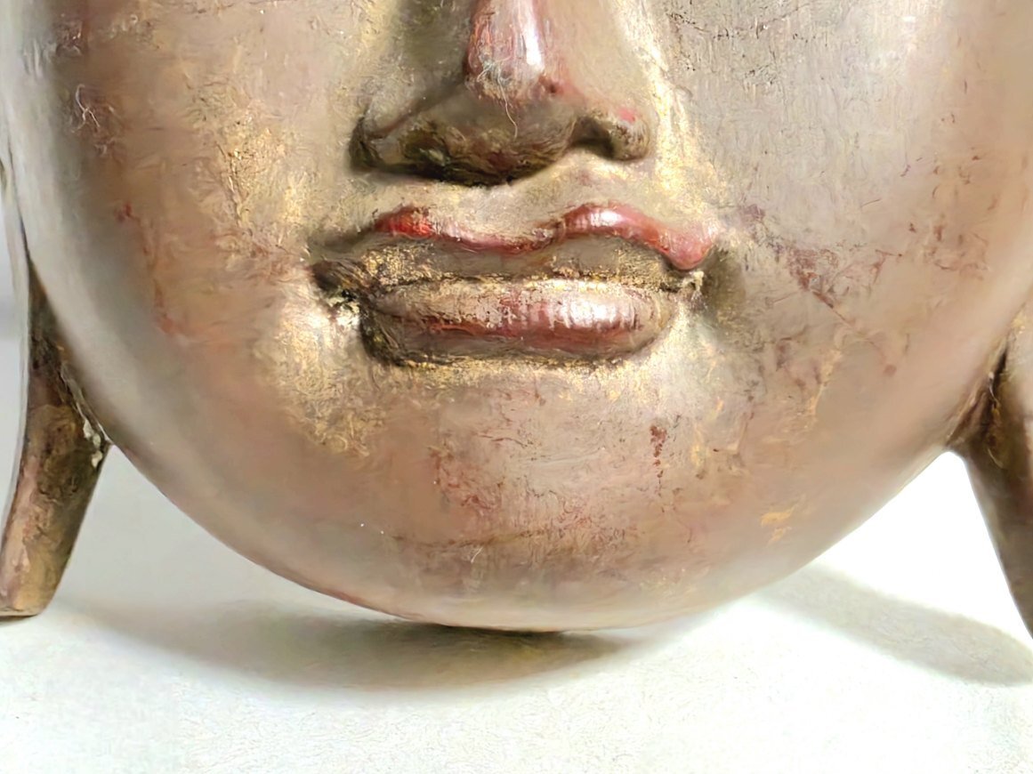 商品説明 落ち着いた表情が印象的な仏像の頭部です。 装飾部分には緑色の装飾が施され、穏やかで優しい雰囲気を感じさせます。 和室やリビングのインテリアとしても存在感があり、空間を静かに彩ります。 詳細 ●サイズ:奥行8cm、縦26cm、横19cm ●素 材:木製 ●ランク:ヴィンテージランク ●コンディション:頭上部に欠けがあります。 表面全体的にスレや汚れがあります。 |