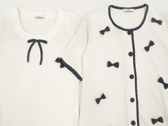 洗える五分袖カーディガン+半袖カットソー アンサンブル2点セット ホワイト&ネイビー×ホワイト ドット柄