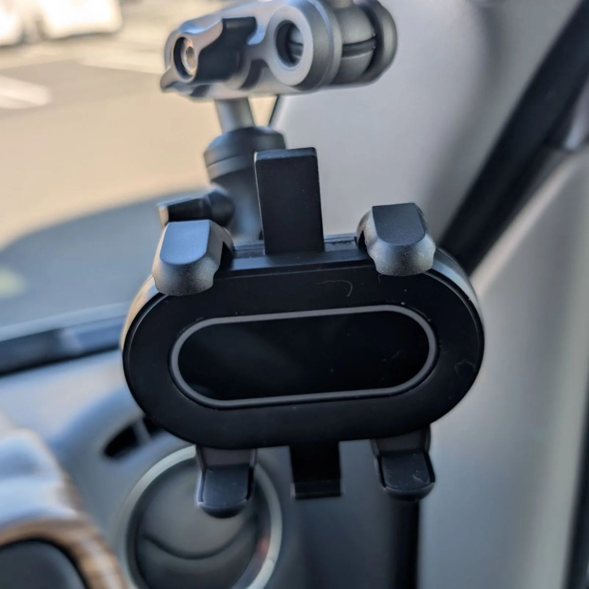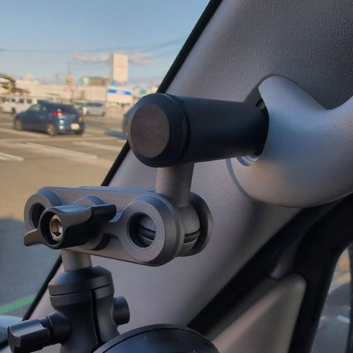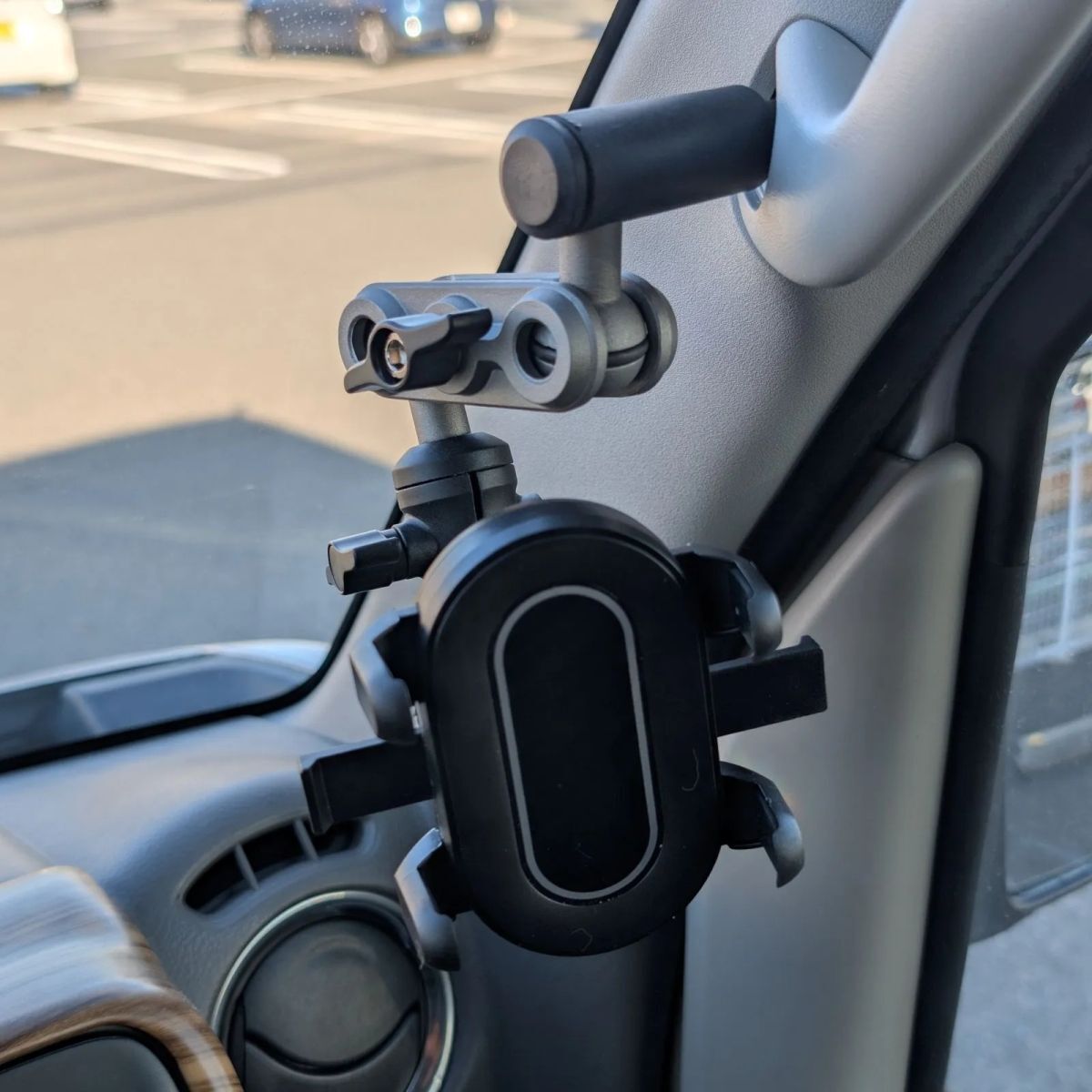 車のピラ-についているアシストグリップのネジ穴に固定するスマホホルダ-。