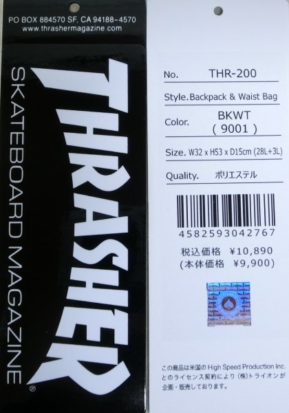 THRASHER スラッシャー・マガジンから生まれた ハードかつ、クールなスケーターブランド ![]() ■【ブランド】 THRASHER(スラッシャー) ■【品番】THR-200 ■希望小売価格 10,890円(税込) ■タグ記載サイズ・容量 ・W32×H53×D15cm ・28L+3L ■色:BK/WT(9001) ■JANコード :4582593042767 ■素材品質 ポリエステル ・水をはじきやすい生地 ■ウエストヒップバックとバックパック が合体 ・ウエストバッグをバックパックに固定できます。 【バックパック】 (収納①-②) ①フロントファスナーポケット ・THRASHERロゴワッペン ②メイン収納 ・ダブルファスナー開閉 ・内にオープン上ゴムポケット全幅1個 ■メイン収納は、ダブルファスナー開閉 ■ボード・ウエストバッグ固定ベルト上下各1本 ■ショルダベルト、長さ調節可、裏メッシュ ■チェストベルトはプラスチックバックル開閉 ■上部にフックベルト ■サイドメッシュポケット、左右各1個 ■背面は通気性の良い、メッシュ+ウレタン。 【ウエスト・ヒップバッグ】 ●容量:約3L ●ロゴプリント ●ウエストベルトはプラスチックバックル開閉 ・内にメッシュポケット ●全幅トップファスナーポケット ●バックパックにベルトでしっかり固定 ※撮影用スマホは白/金 iPhone SE 4インチ ※撮影用小物は付属しません。 ![]() 【mobus モーブスはこちら】 ![]() 【OUTDOORボディバッグはこちら】 タップして検索して下さい。 ![]() ※値引き・セットの組替・早期終了の要請は、固くお断りいたします。 | |