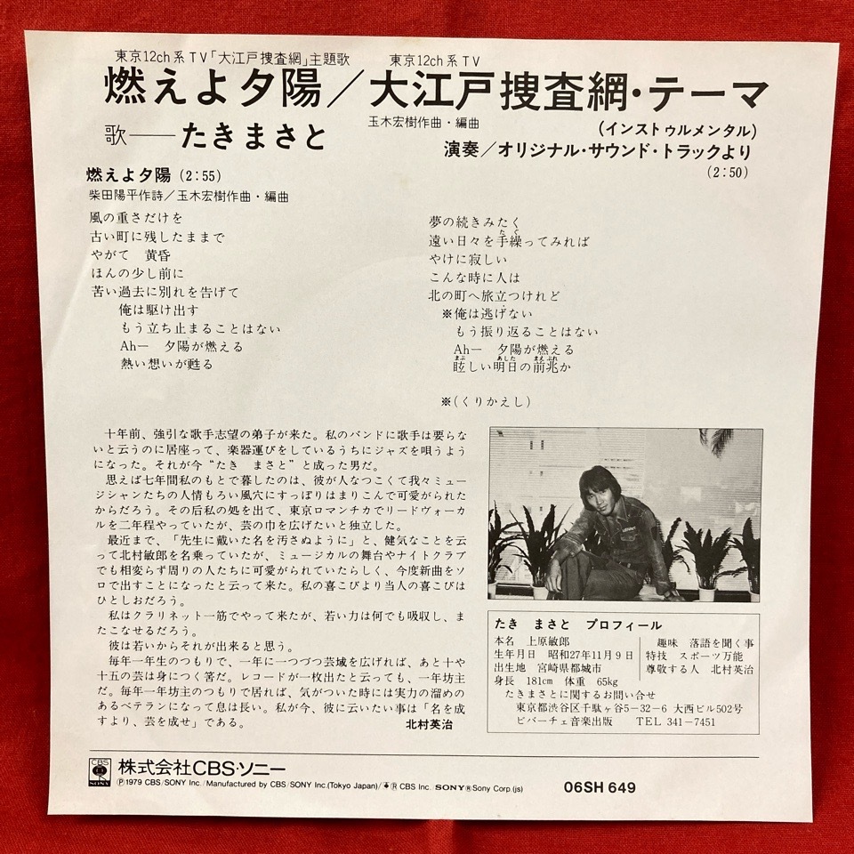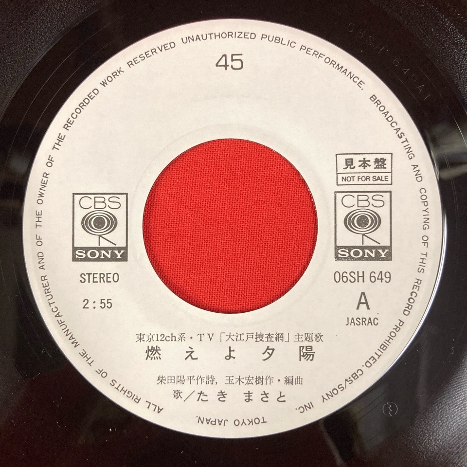 【アーティスト】 たきまさと 【タイトル】 燃えよ夕陽 【規格番号】 06SH649 【商品説明】 7インチシングル/見本盤白ラベル 1979年シングル/大江戸捜査網 【状態】 EX/EX |