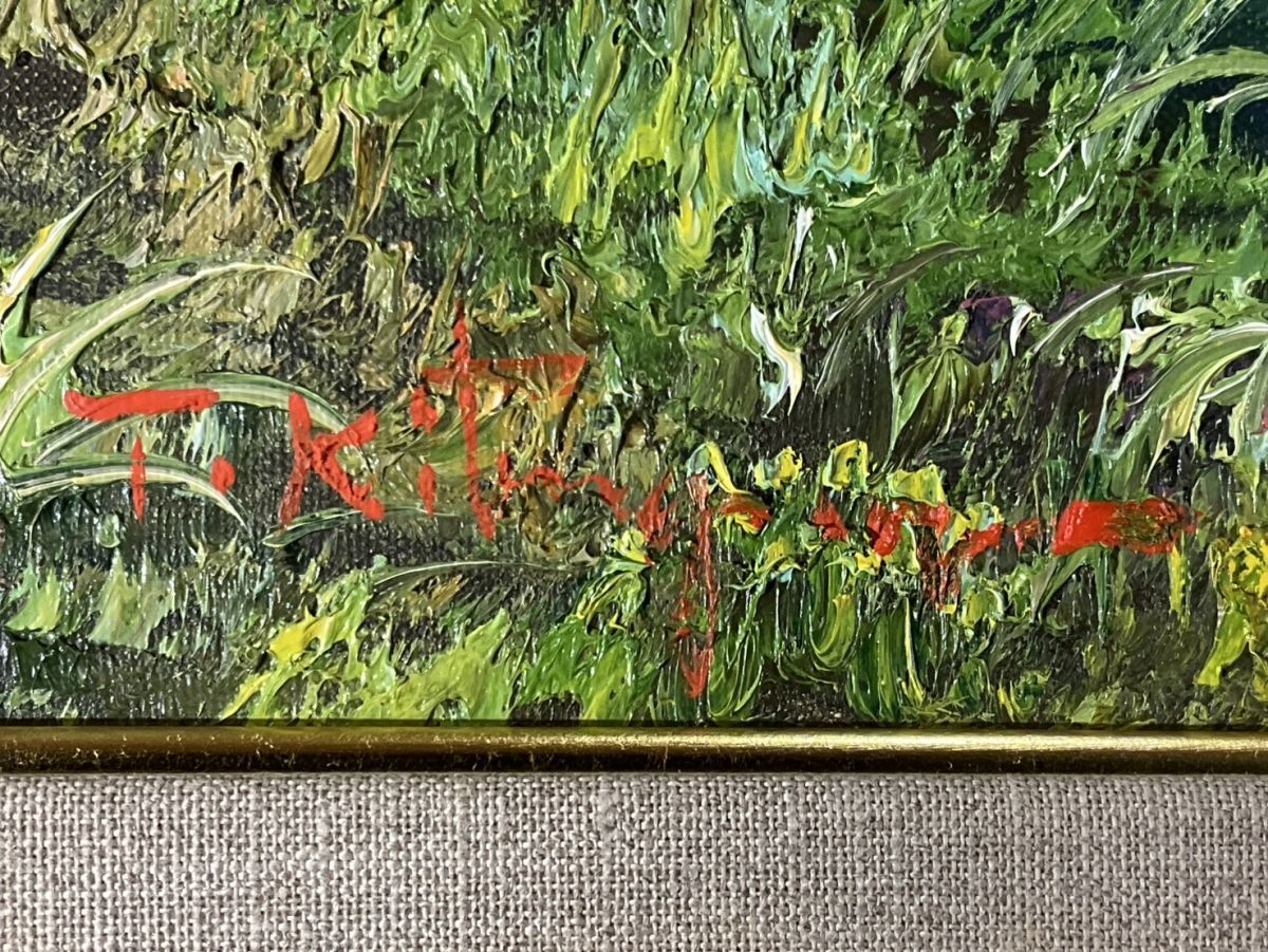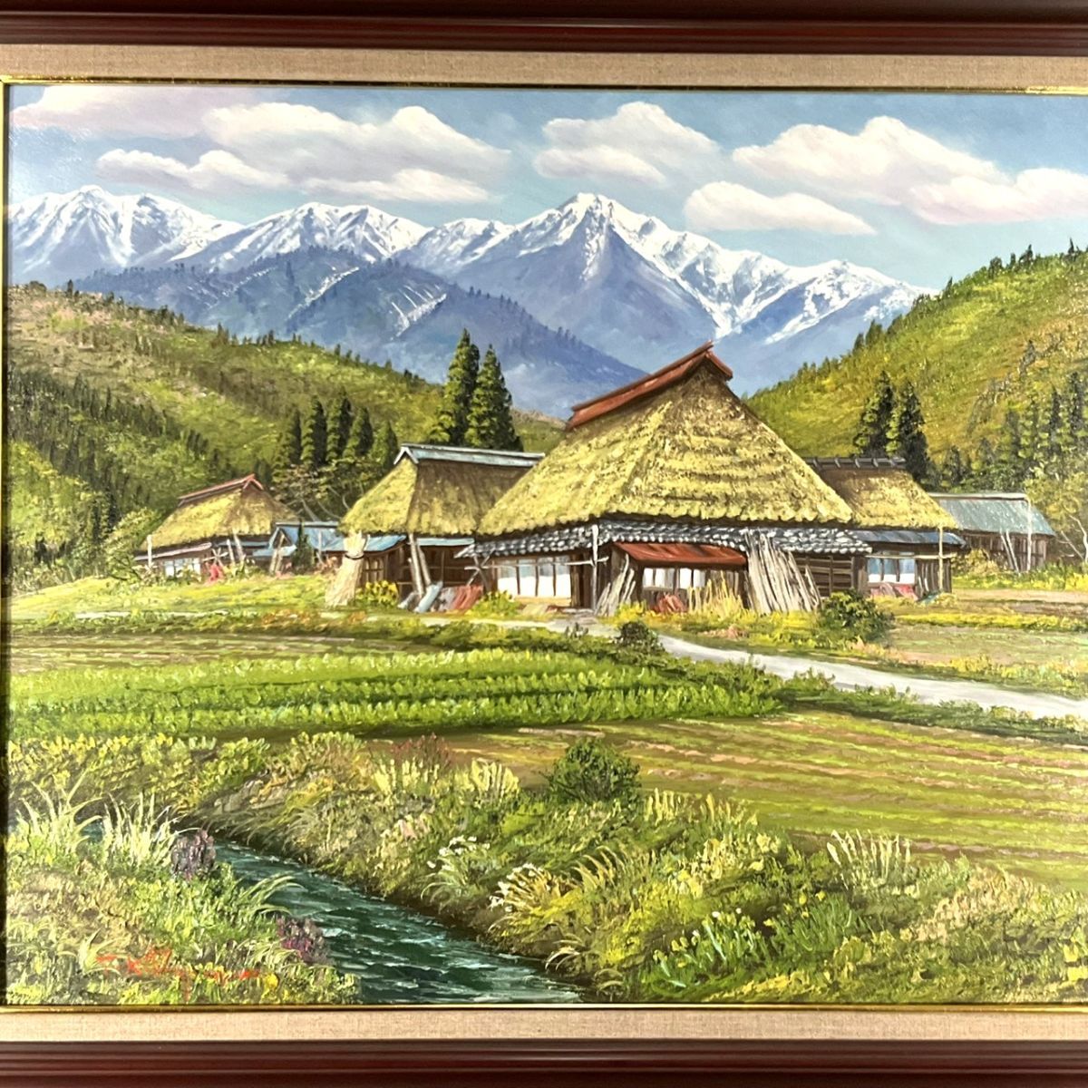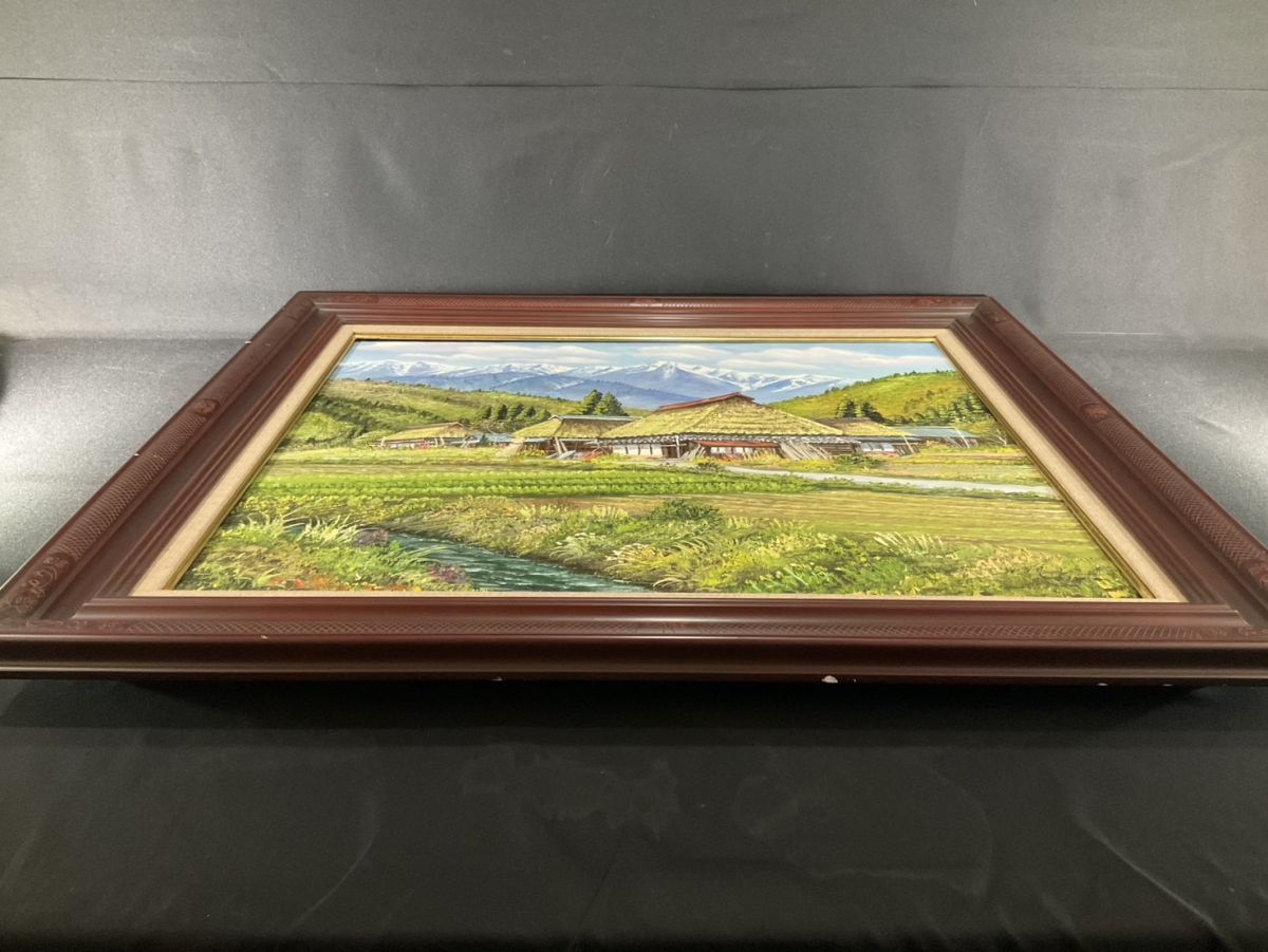 真作■油彩■北川照生■『奥信濃の山郷』■20号・大型最高傑作■茅葺屋根■細密に描かれた逸品■額付絵画