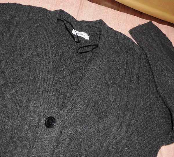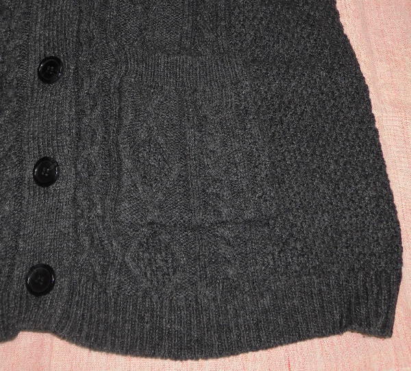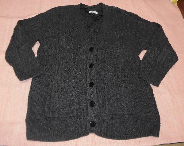 | よく着用しましたので、袖に毛玉があったり、やや使用感があります。 お安くどうぞ! ☆ サイズはF ☆ 色は濃いグレー ☆ 実寸は、身丈68センチ、肩幅43センチ、袖丈51センチ、 脇下の幅53センチ、裾幅50センチ ☆ 綿54%、ナイロン32%、毛14% ☆ ポケット2つあり ☆ ボタン開閉 ☆ 模様編み ☆ Vネック レプシィム アダストリア | ||