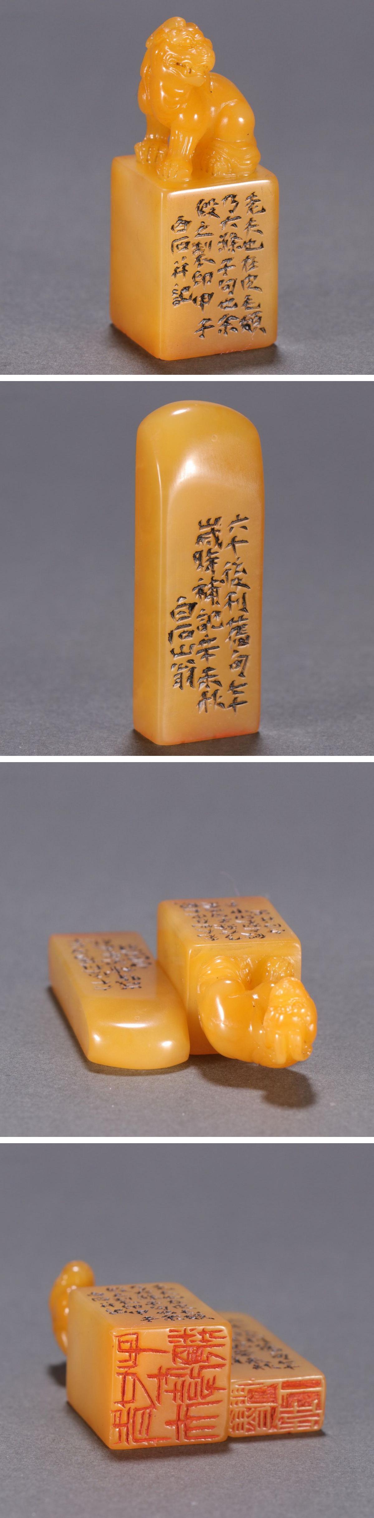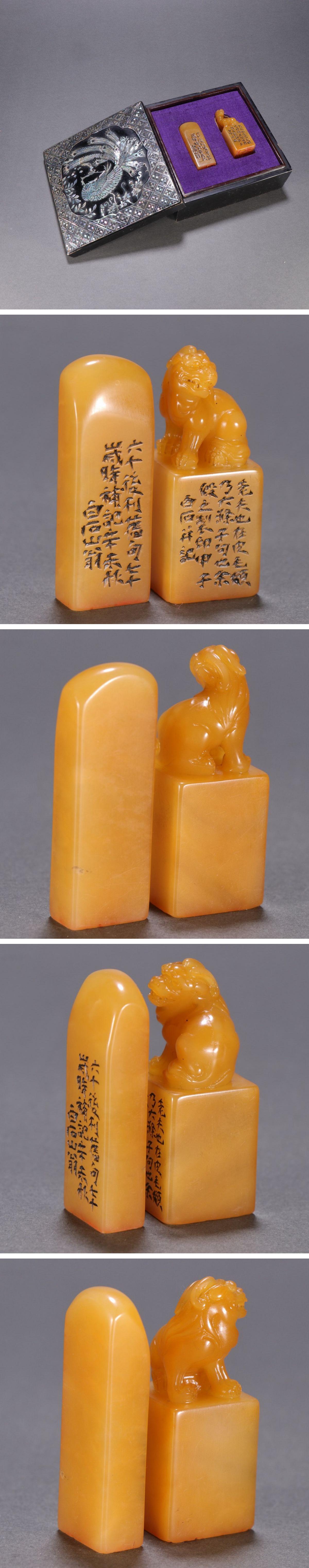 【清】某有名オークション購入 時代物 白石在銘 寿山田黄石 唐獅子紋印章二点セット 材質保証 古置物 古擺件 古美術 時代コレクション7L10-CX17