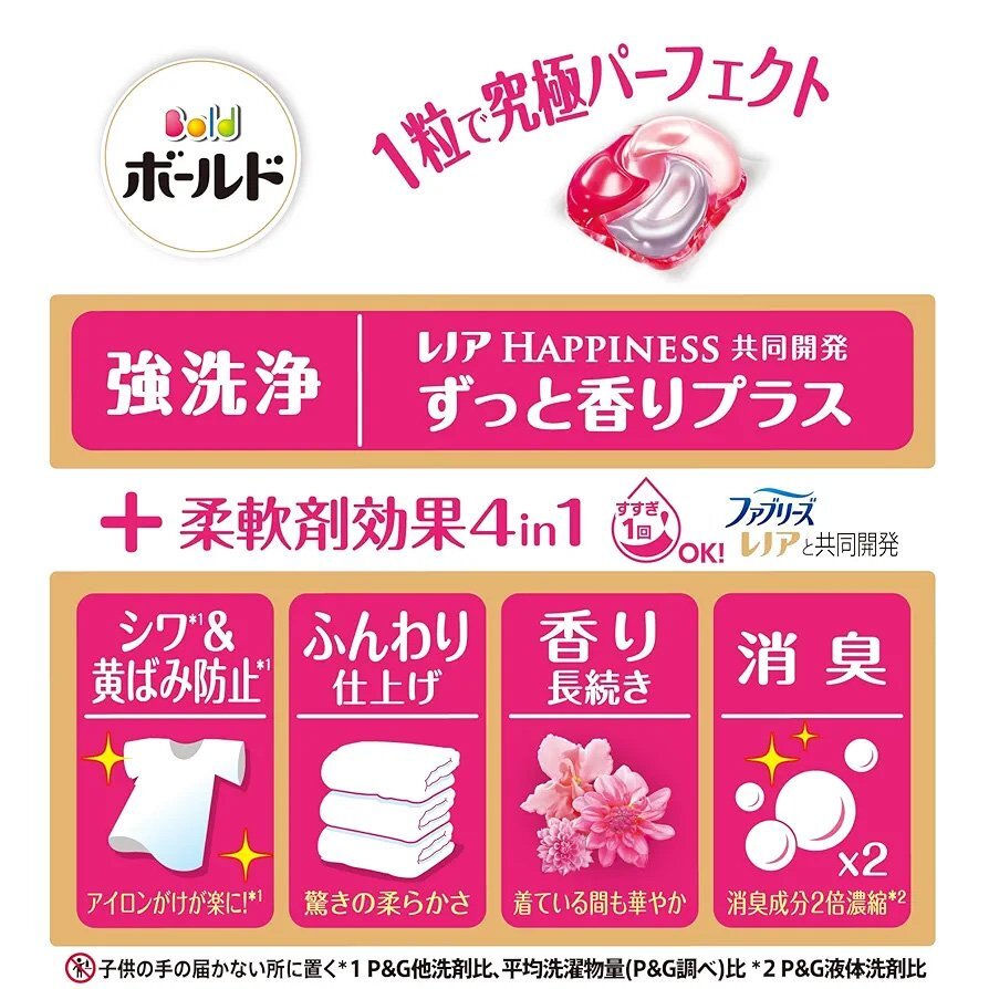 | 商品の説明 | 部屋干しでも天日干し級の爽やかさ!ファブリーズ レノアと共同開発 ずっと香りプラス 1粒で究極パーフェクト 柔軟剤効果 4 in 1 強洗浄 洗い上がり輝く白さ シワ*1 &黄ばみ防止*1 アイロンがけが楽に!*1 ふんわり仕上げ 驚きの柔らかさ 香り長続き 着ている間も華やか 消臭成分2倍濃縮*2 縦型・ドラム式・すすぎ1回OK *1 弊社他洗剤比、平均洗濯物量(P&G調べ)比 *2 当社液体洗剤比 ボールド 洗濯洗剤 ジェルボール 4in1 華やかおひさまとプレミアムブロッサムの香り |
