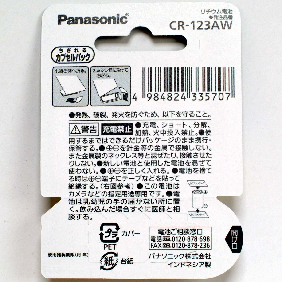 | リチウム電池 CR123A【1個】 未使用、未開封の新品で、 使用推奨期限が2032-6(以降) のものをお送りします。 ・パナソニック / Panasonic ・型番: CR-123AW ・公称電圧: 3V ・円筒形電池 ・インドネシア製 ・JAN 4984824335707 ・相当品: K123LA, EL123AP, DL123A, CR123R ×充電式ではありません パッケージのデザインは多少異なる場合があります。 ----------------------------------------- ■この商品は下記の配送方法に対応します。 複数落札や他商品と同梱の際は、その都度お見積もりします。 ※リチウム電池は空輸できないため、沖縄県や離島をはじめ、 遠方宛は通常以上の配達日数を要する場合があります。 ●ヤマト運輸 宅急便 元払 (この送料で「数量40」まで同梱可) ・北海道:1,400円 ・青森/岩手/秋田県:1,020円 ・宮城/山形県/~この間の地域すべて~/三重/岐阜/福井県:900円 ・滋賀/京都府/大阪府/兵庫/奈良/和歌山県:1,020円 ・岡山/鳥取/広島/島根/山口/四国各県:1,150円 ・九州各県:1,400円 ・沖縄県:1,460円 ○宅急便の配達日時の指定は、希望通りにならない可能性をご了承の上でお受けします。 ただし天候や交通事情等により、100%の確約はできません。 指定できる時間帯 (指定なし, 8-12, 14-16, 16-18, 18-20, 19-21時) ・お届けの際に受領印が必要です (宅配BOX等があれば、この限りではありません) ●ヤマト運輸 宅急便コンパクト(専用BOX代込) 元払 (この送料で「数量30」まで同梱可) ・北海道:940円 ・青森/岩手/秋田県:780円 ・宮城/山形県/~この間の地域すべて~/三重/岐阜/福井県:700円 ・滋賀/京都府/大阪府/兵庫/奈良/和歌山県:780円 ・岡山/鳥取/広島/島根/山口/四国各県:830円 ・九州各県:940円 ・沖縄県:940円 ○宅急便コンパクトの配達日時の指定は、希望通りにならない可能性をご了承の上でお受けします。 ただし天候や交通事情等により、100%の確約はできません。 指定できる時間帯 (指定なし, 8-12, 14-16, 16-18, 18-20, 19-21時) ・お届けの際に受領印が必要です (宅配BOX等があれば、この限りではありません) ●佐川急便 飛脚宅配便 元払 (この送料で「数量40」まで同梱可) ・北海道:1,000円 ・青森/岩手/秋田:760円 ・宮城/山形/~この間の地域すべて~/三重/岐阜/福井:690円 ・京都/滋賀/奈良/和歌山/大阪/兵庫:760円 ・岡山/広島/山口/鳥取/島根:820円 ・四国各県:940円 ・九州各県:1,000円 ・沖縄県:1,914円 ・離島は中継料金が別途加算される場合があります。 ・お届けの際に受領印が必要です (宅配BOX等があれば、この限りではありません) -------------------------- ■以下の配送方法は 簡易梱包 になります。 厚さや重さ、荷姿に制約があるため、緩衝材をほとんど使えず、商品を茶封筒等に単に封入するだけになります。 潰れや角折れ等の傷みが発生する可能性が高くなりますので、あらかじめご了承ください。 未着・紛失や破損、また初期不良があっても返品・返金・修理・交換等の対応外とします。 -------------------------- ●ヤマト運輸 ネコポス : 385円 (この送料で「数量20」まで同梱可) ・配達日時は指定できませんが、東北~関西宛は出荷日の翌日配達が基本です。ただし天候や交通事情等により、100%の確約はできません ・受取人様宅の郵便受に配達(投函)されます。受領印は不要 ・紛失・破損等(初期不良が疑われる場合も含む)あっても補償はありません ●日本郵便 レターパック・プラス : 600円 (この送料で「数量32」まで同梱可) ・配達日時や配達期限は指定できません ・お届けの際に受領印が必要です (不在時に宅配BOXへ配達希望の場合は、宛名に「宅配BOX希望」と書き添えてください) ・紛失・破損等(初期不良が疑われる場合も含む)あっても補償はありません ●日本郵便 レターパック・ライト : 430円 (この送料で「数量20」まで同梱可) ・配達日時や配達期限は指定できません ・受取人様宅の郵便受に配達(投函)されます。受領印は不要 ・紛失・破損等(初期不良が疑われる場合も含む)あっても補償はありません ●日本郵便 クリックポスト : 185円 (この送料で「数量20」まで同梱可) ・配達日時や配達期限は指定できません ・受取人様宅の郵便受に配達(投函)されます。受領印は不要 ・紛失・破損等(初期不良が疑われる場合も含む)あっても補償はありません ●日本郵便 スマートレター : 210円 (この送料で「数量10」まで同梱可) ・配達日時や配達期限は指定できません ・配送日数 1週間~10日 ・受取人様宅の郵便受に配達(投函)されます。受領印は不要 ・紛失・破損等(初期不良が疑われる場合も含む)あっても補償はありません ●日本郵便 普通郵便 : 140円 (この送料で「数量1」まで) ◆「数量2~3」のときは180円 ・配達日時や配達期限は指定できません ・配送日数 1週間~10日 ・受取人様宅の郵便受に配達(投函)されます。受領印は不要 ・紛失・破損等(初期不良が疑われる場合も含む)あっても補償はありません ●ゆうパケットポスト(匿名配送) : 230円 (この送料で「数量20」まで同梱可) ・配達日時や配達期限は指定できません ・配送日数 1週間~10日 ・受取人様宅の郵便受に配達(投函)されます