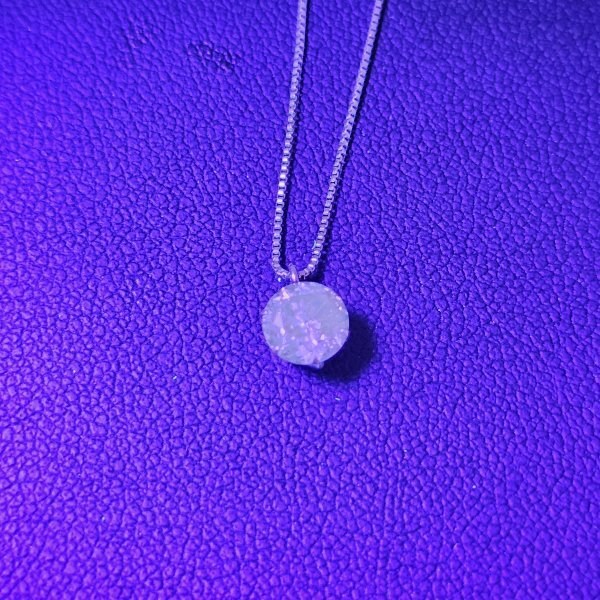 写真のようにブラックライトを当てるとダイヤモンドが青く蛍光します。これは天然ダイヤモンドが持つ「蛍光性」という性質によるものです。キュービックジルコニアなど人造石では見られない反応のため、天然ダイヤモンドであることの証明になります。