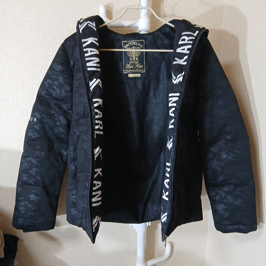 カールカナイ(ビート)のダウンジャケットです。サイズはMで、チェスト88~96センチ、身長165~175センチで、実寸でおおよそ肩幅40センチ、身幅52センチ、着丈69センチ、袖丈64センチです。素材は、表地がポリエステル100%で、裏地がポリエステル100%で、羽毛がダウン80%、フェザー20%で、リブがポリエステル98%、ポリウレタン2%で、中わたがポリエステル100%です。色は、黒色で、迷彩柄です。多少使用感などございますが特に目立つキズや汚れは無いと思います。
