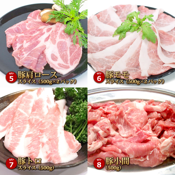 豚1頭の精肉をまるごと約10kg、のセット品です。 《セット内容》 ・ロースブロック1kg ・肩ロースブロック1kg ・肩ローススライス500g*2パック ・ももスライス500g*2パック ・バラブロック1kg ・バラスライス500g*2パック ・小間肉1kg ・豚トロ500g ・豚モツ(ボイル)1kg ・でかでかフランク3本 ・スペアリブ1枚 ◎各部位はそれぞれ真空パック済みのため、お受取後の処理がカンタンです。 |