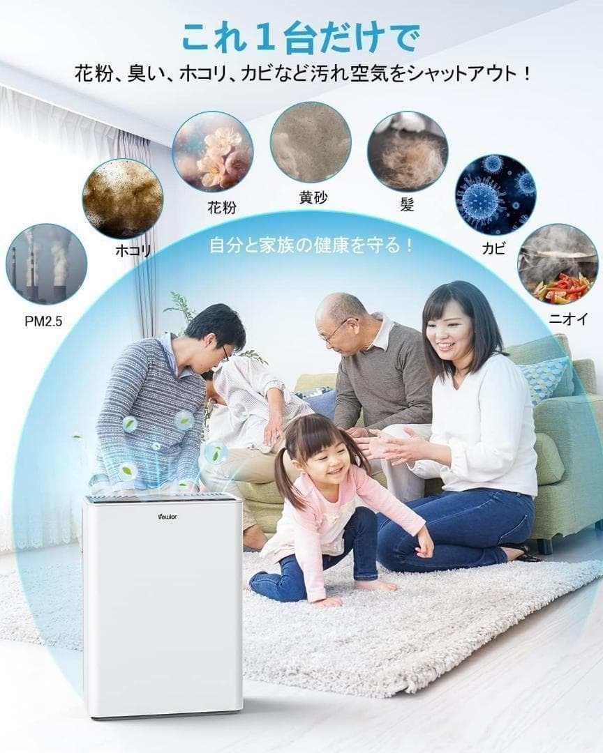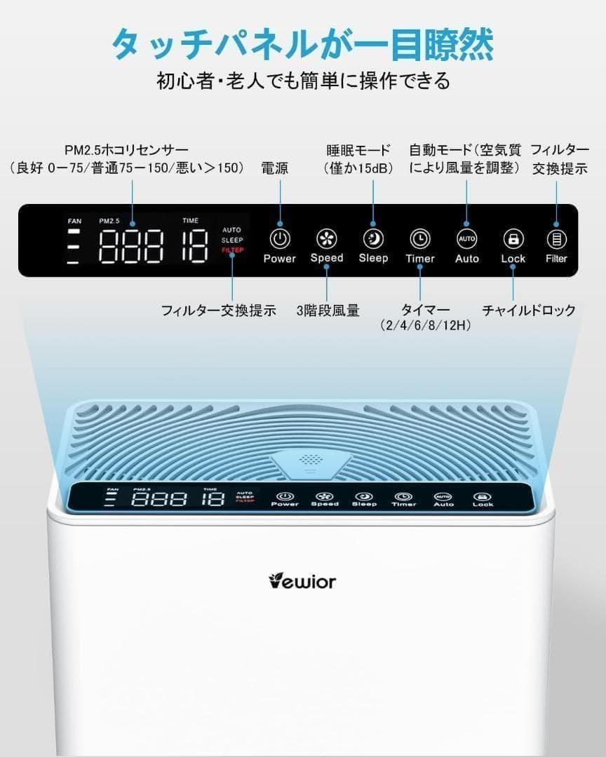 【50畳清浄&高性能HEPA13フィルター&アロマ対応】①vewior空気清浄機は1時間以内に、50畳までの部屋をカバーし、1時間あたり5倍の空気を清浄できます。普通の空気清浄機に比べて、リアルにお部屋の全体をカバーし空気清浄を行います。②高性能のHEPA13フィルターを採用し、大きなホコリやゴミを集める「プレフィルター」、細かい浮遊物質を集める「集じんフィルター」、50%活性炭を使った「脱臭フィルター」の3層構造で汚れた空気やニオイをパワフルで清浄し、微細粒子など有害物質を99.99%※除去し、キレイな空気を提供します。高性能除去機能とハイスピード清浄を両立する理想の空気清浄機です。交換用のフィルターも販売しています。交換用フィルターの検索コードはB0C1FXW62Wです。③空気清浄器はアロマ対応して、お好きなアロマオイルトップにあるパッドに入れたら、アロマディフューザーになります。