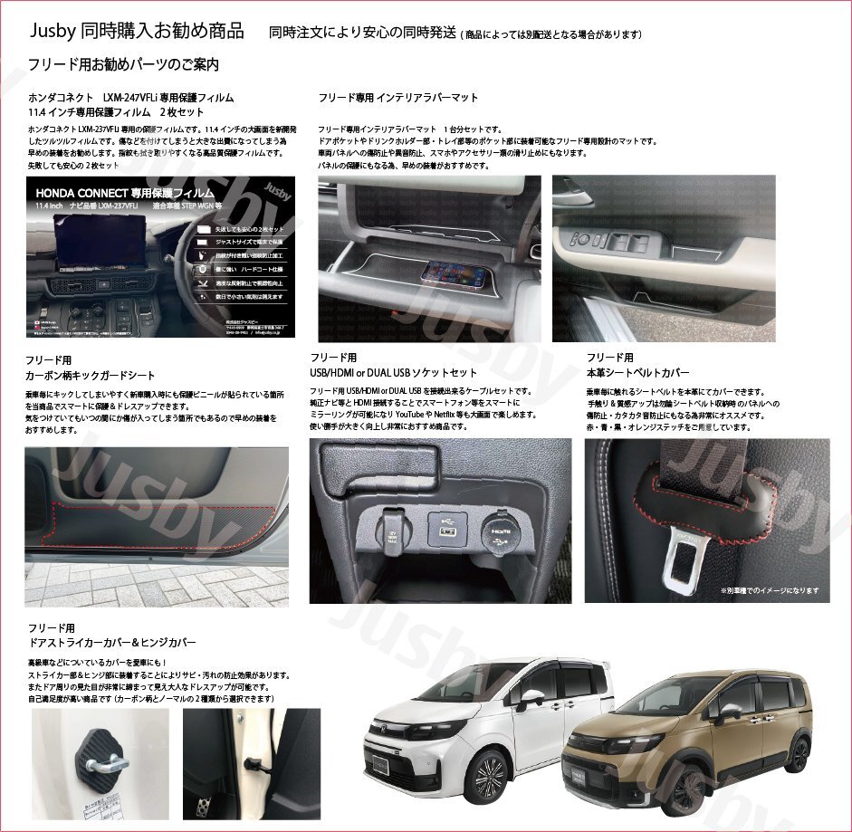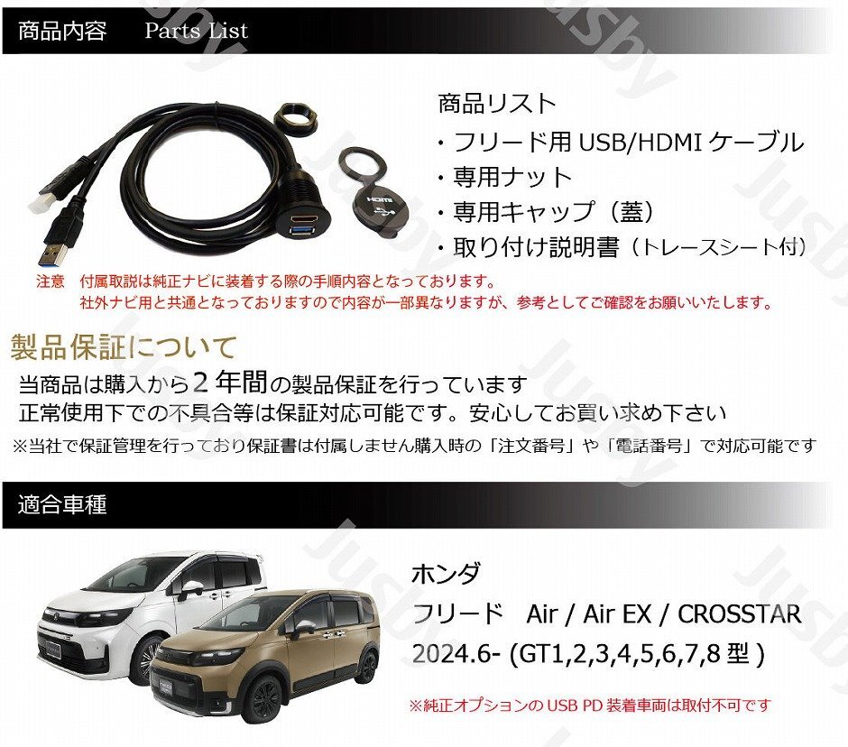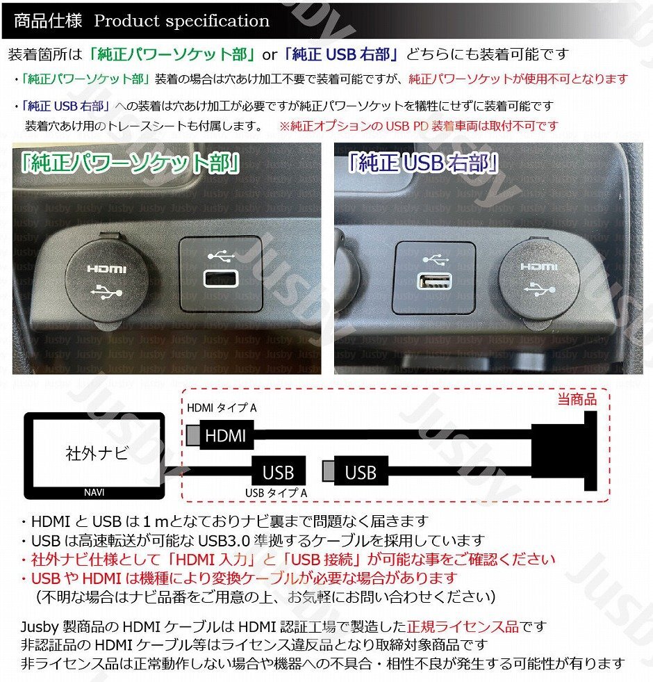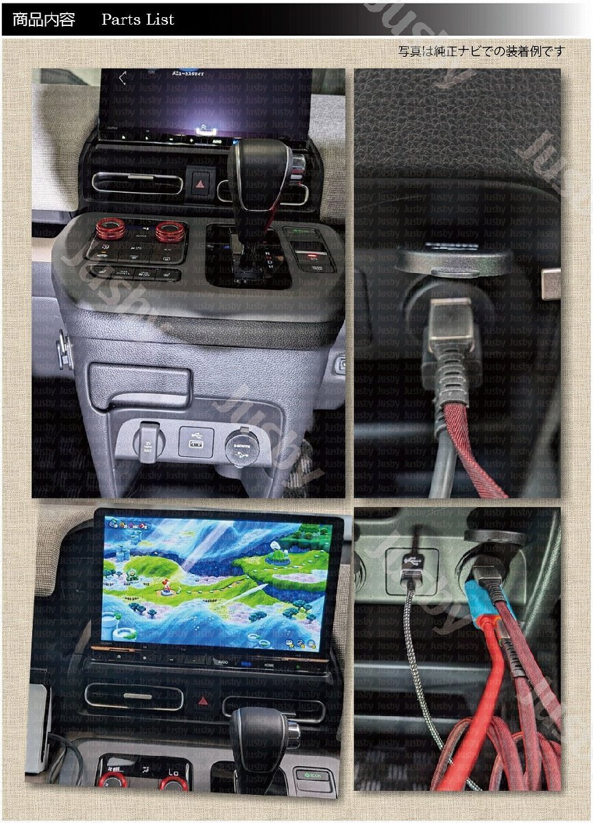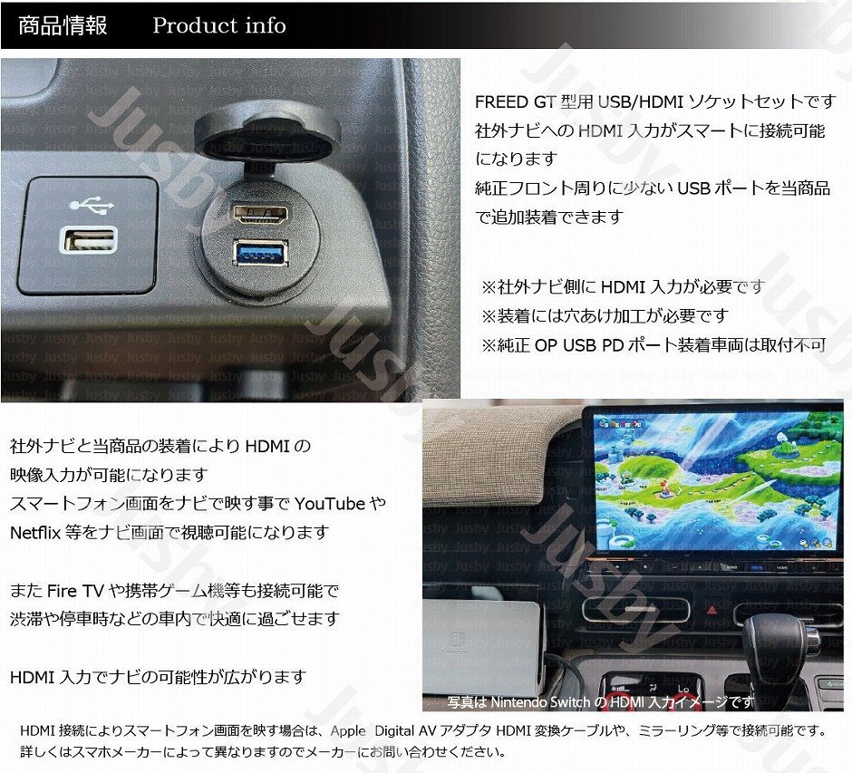 | ホンダ フリード(FREED) GT型 USB&HDMIソケットセット 【社外ナビ用】です GT型フリード用 社外ナビ用 USB/HDMIソケットセットです。 当商品でUSB&HDMIポートを使い勝手の良い純正コンソール部分に装着可能です。 HDMIをナビと接続してスマートフォンの画面等をナビに映すことが可能となり、youtubeやNetflix等をミラーリング可能です。 その他携帯ゲーム機(Nintendo Switch等)、ミラーキャスト、Fire TV等も接続可能となりナビの可能性が広がります。 【注意事項】 ・社外ナビ仕様として「HDMI入力」と「USB接続」が可能な事をご確認ください ・USBやHDMIは機種により変換ケーブルが必要な場合があります (不明な場合はナビ品番をご用意の上、お気軽にお問い合わせください) ・付属取説は純正ナビに装着する際の手順内容となっております。社外ナビ用と共通となっておりますので内容が一部異なりますが、参考としてご確認をお願いいたします。 ・装着位置は「純正パワーソケット部」と「純正USB右部」どちらにも装着可能です。(注意事項があります画像をご確認ください) ・「純正パワーソケット部」に装着の場合は純正パワーソケットを取り外した箇所に設置する為、純正パワーソケットが使用不可になります。 ・「純正USB右部」に装着の場合は穴あけ加工が必要です。付属トレースシートを利用して穴あけ加工をお願いします ・純正オプションの【USB PDチャージャー(フロント用) USB Type-C】 装着車両は「純正USB右部」への装着はできません ・当商品のUSBポートは給電専用となりナビとは接続できません 商品はHDMI認証工場で製造した正規ライセンス品です。また2年間の製品保証つきです。PL保険(製造物賠償責任保険)加入済みです。 また1年間の製品保証付きです(保証書は付属しません注文番号にて保証対応可能です) スタッフレビュー HDMIとUSBポートを違和感無く使いやすいセンターコンソール部に取付できます。 フロント周りにUSBポートが少なく、純正ナビはHDMI入力機能もある為 専用のUSB&HDMIを設定しました。 HDMI入力やUSBがスマートに接続できますので非常におすすめです。 |