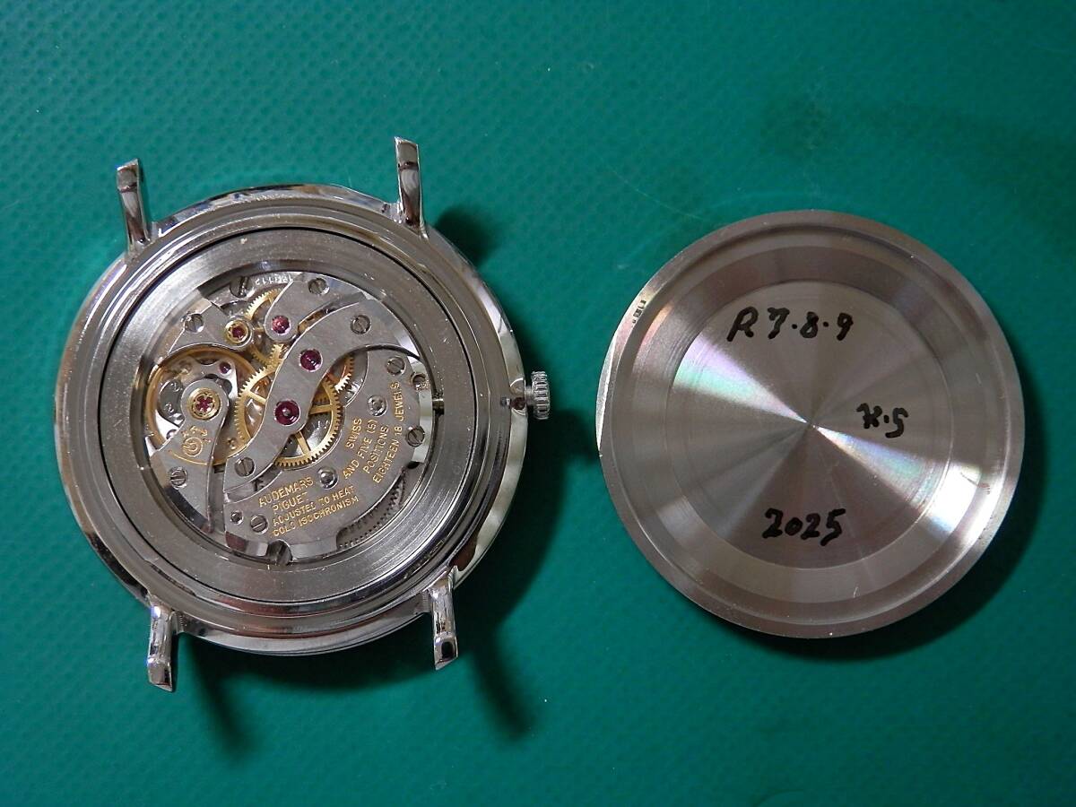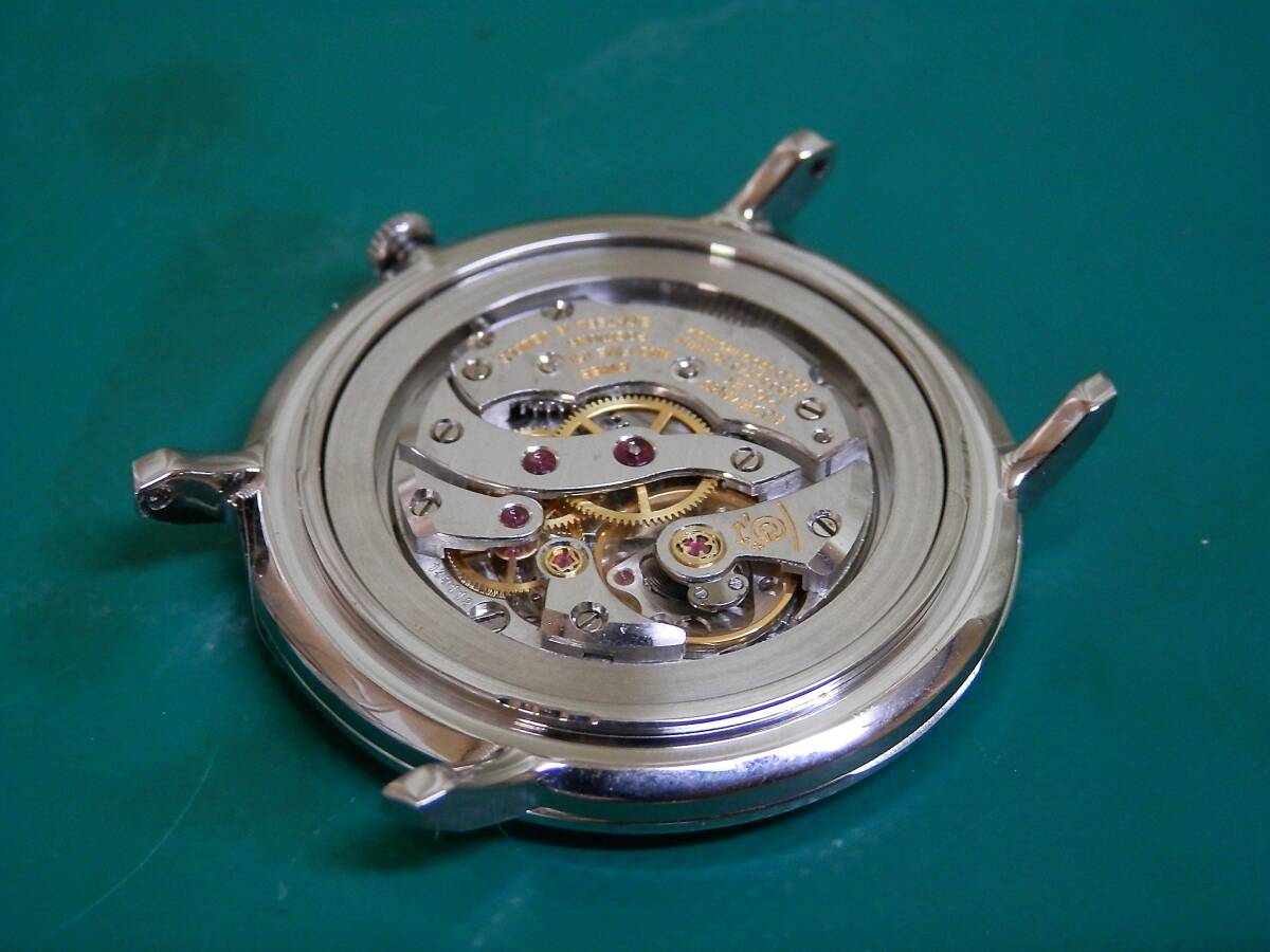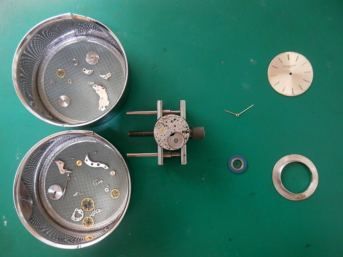 | 【はじめに】 誤入札にご注意ください!! ★本品はオーデマピゲの純正ムーブメントにジャストフィットする他社製風防付きケース【ステンレス・新品仕上げ済】を組み込んだcomplete時計です。ケースの厚み・径はオリジナルとほぼ同じです。形はオリジナルと異なります。 ※ケースとは、メインボディ・裏蓋・風防・ベゼル・ムーブメントホルダーの5パーツの集合体を指します。 説明文を最後までよくお読みになり納得の上ご入札ください。入札いただいた時点ですべてを理解したものと解釈させていただきます。 新規の入札は申告制でお願いしています。質問欄から御連絡後に入札をしてください。 ★リダン文字盤はギラギラでは無く落ち着いたサテン状のつや消しシルバー文字盤です。 ★文字盤の印字はオリジナルと同じ印刷方法と同じ種類のインクを使用しています。 ★ゼンマイを新品と交換しました。 ★風防は新品無反射コーティング済みカーブサファイアクリスタルガラスを使用しました。 ★CAL.K2001/1Aは、緩急針ではなく天輪に取り付けたオモリの位相を変えることで精度調整を行うフリースプラングテンプを採用しています。天輪はパティックフリップが開発したジャイロマックステンプを使用しています。フリースプラングテンプは調整範囲が2分程度と大変狭いため、正確な作りの一部の高級ムーブメントにしか使われません。フリースプラングテンプは次のようなメリットがあるため、現在は各社フリースプリングテンプへの移行が進んでいます。 ●調整がズレにくく安定している。 ●ヒゲゼンマイに負担をかけない。 ●高い精度調整が可能。 ●姿勢差による振れの乱れが少なく精度が安定している。 ◆本品は分解掃除済みですので次回までOHの必要はありません【分解写真有ります】 。 OH後は未使用です。 ◆針はオリジナル(AP純正) です。リダン文字盤の印字はオリジナルを基に作成しました。色はシルバーです。14KYG地板は純正品です。竜頭は他社製ですが、パッキン付きを使用しています。 ケース・風防・バンド(バックル込み)は他社製です。バンドはワニ革(新品)高級バンドを使用しました。 ※アンティーク時計の状態を評価する時には個人差が出ます。神経質なかた・細かいことを気にされるかた・アンティーク時計にご理解の無いかた・クレームを付けるかたは入札をご遠慮ください。 ※キズ・サビ・汚れ等の外観・精度が理由での返品は出来ませんので予めご了承ください。 ※写真と若干の色の誤差が出る場合がありますが、同一商品です。 今回オークション出品のためにOHをしました。 裏蓋に日付の記載有ります(R7/8/9) 【OH内容】 ①分解掃除・注油 ※香箱は、ゼンマイを外し洗浄・注油をしています。その結果ゼンマイの滑りが良くなることでパワーが復活し、稼働時間が延びます。故障には直接関係しないため、手抜きで外さずに済ます業者もかなり存在します。 ★ムーブメントパーツはドイツ製の高級専用洗浄液を使用し、業務用超音波洗浄器にて洗浄しています。油汚れは勿論サビを落とす効果もあり、その結果金属の輝きがよみがえります。注油には、3種類のスイス製オイルを使用しています。 ②針のクリーニング ※針は軸にキズがありますが、その他は割と綺麗です。リダン文字盤は、制作時にわずかなキズ・汚れが付く場合がございますが、本品はほぼトラブル無く綺麗に仕上がりました。 ③ケースは新品仕上げをしました。ケース側面と裏蓋はヘアライン仕上げです。 ※細かい傷がある場合がございます。予めご承知ください。 ※調整のため数回ほど文字盤側と裏蓋の開け閉めを行うためオープナーの痕がありますが、あらかじめご了承ください。 ④風防は新品の無反射コーティング済みサファイアクリスタルガラスを使用しました。 ⑤テンプの振れを安定させるため、片振り調整と磁気抜きをしました。 ⑥時間調整【タイムグラファー使用】 ☆30時間以上パワーリザーブテスト済み ⑦バンド(ストラップ)は新品を取り付けました【クロコダイルバンド】 ☆バンドカラー:半つや黒 ☆ステッチ付き ※本品は裏ぶたなどにパッキンが入らない非防水時計になります。 仕様など ムーブメントメーカー:オーデマ・ピゲ(AP) キャリバーナンバー: CAL.K2001/1A(手巻き2針)(5ポジションクロノメーター) 石数:18石 振動数: 18000振動/時間 シリアルナンバー:1391~ サイズ: ケース経→横約33.85㎜(竜頭除く)・縦約37.70㎜㎜(ラグ含む) ラグ幅→18㎜ ケース厚み→約6.75㎜(風防込み) 付属品:保証内容を記した書類・レザー調BOX【黒】 精度:平置きにて測定日差±0~20秒前後に調整してあります。(腕に着用での調整はしていません)。 ※ゼンマイフル巻状態での測定です。 ※精度はOHした時点のものです。予めご了承ください。出荷前に再チェックします。 ※機械式時計の精度は姿勢差・温度・湿気・磁気・気圧・振動・衝撃などの外部環境により影響を受けます。上記の精度は参考になります。 | |||