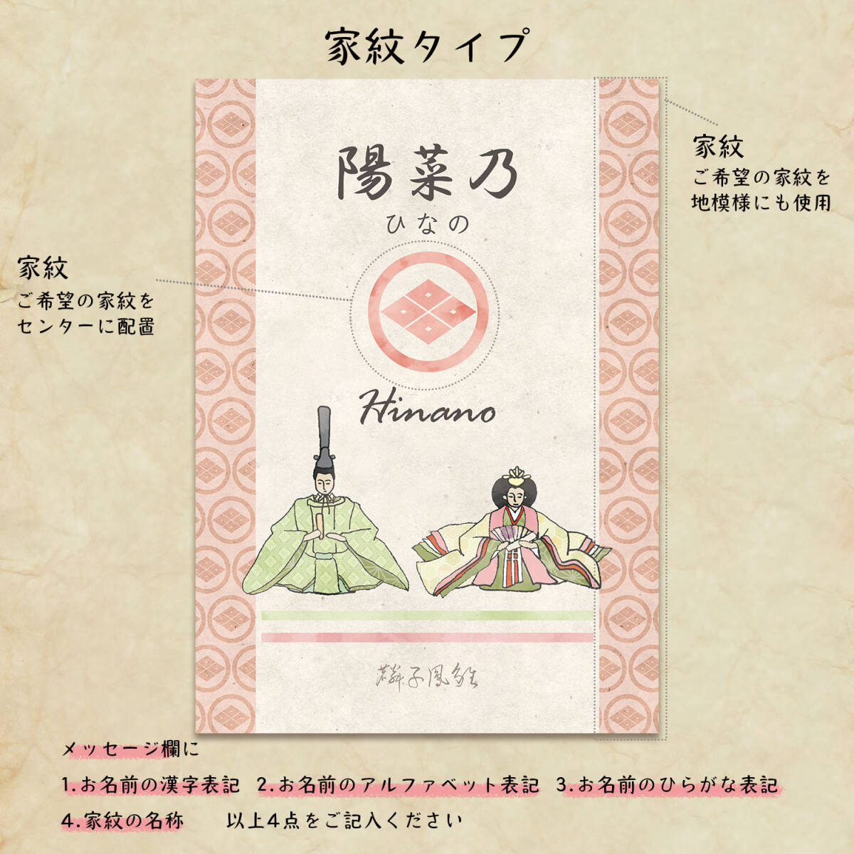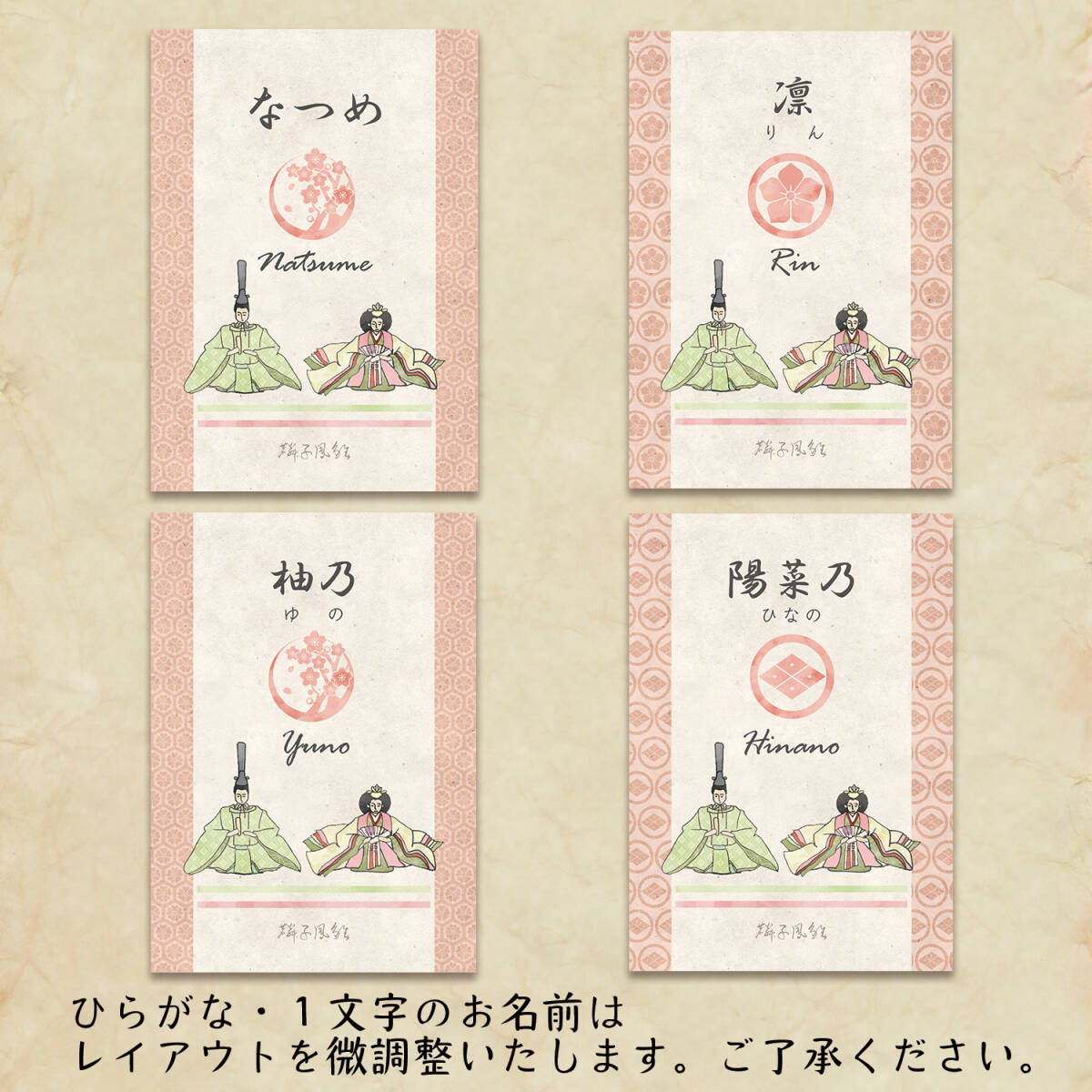 お子様のお名前を「漢字」「ひらがな」「アルファベット」で記載いたします。 全体に和紙の地模様を使っています。 上質紙への出力ですが、 マットな和紙のような仕上がりに見えます。