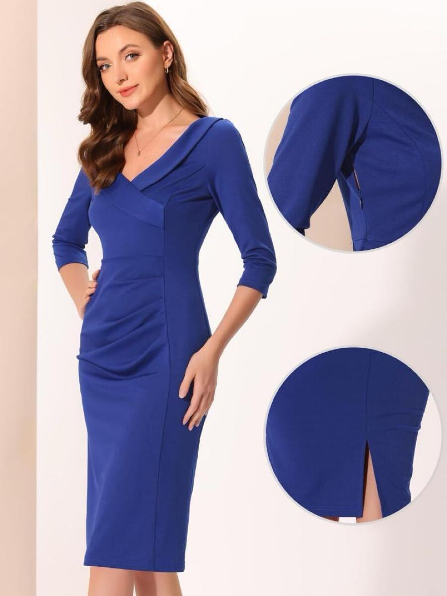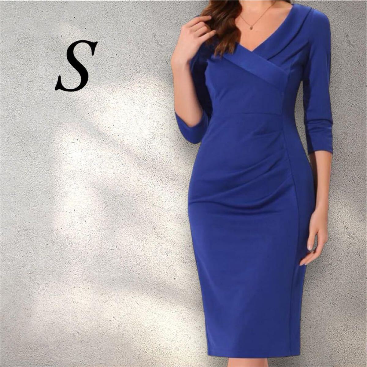 ボディコンドレス 無地 Vネック 7分袖フリルフロント イブニング S ブルー