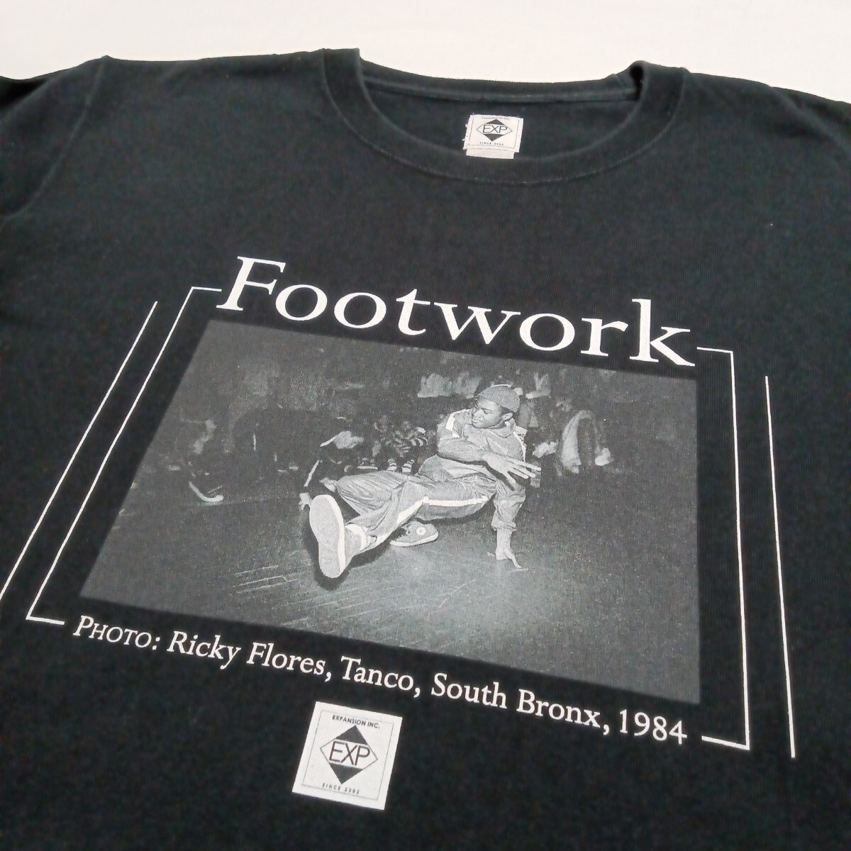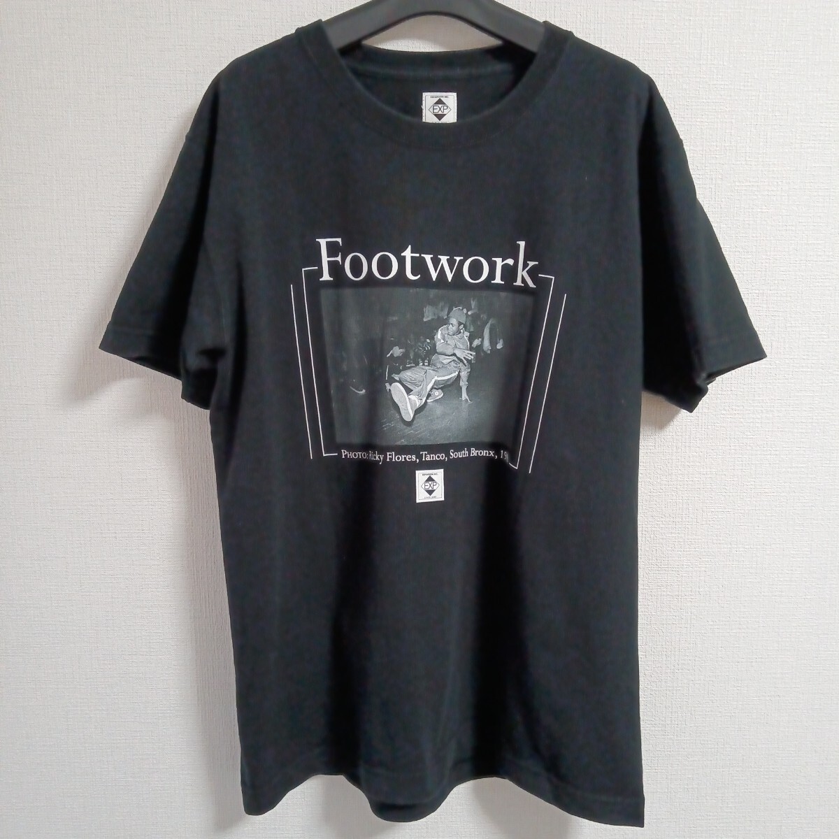 フロントに「Footwork」と1984年の写真をプリントしたブラックTシャツ。 - 色: ブラック - デザイン: フロントプリント(写真) - テキスト: Footwork, PHOTO: Ricky Flores, Tanco, South Bronx, 1984 - スタイル: クルーネック - バックデザイン: 無地 着丈66、身幅51、肩幅46、袖丈19センチ。 使用感少しだけありますが、大きなダメージありません。 ご覧いただきありがとうございます。