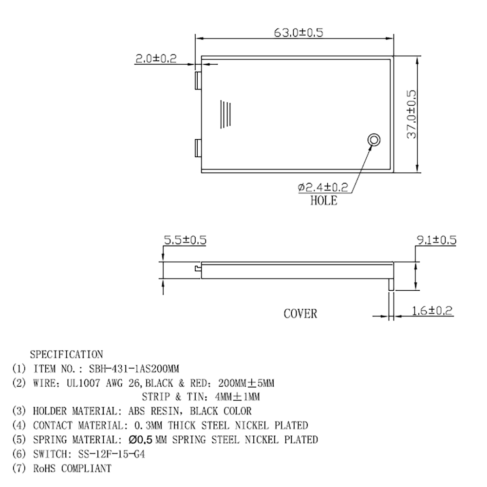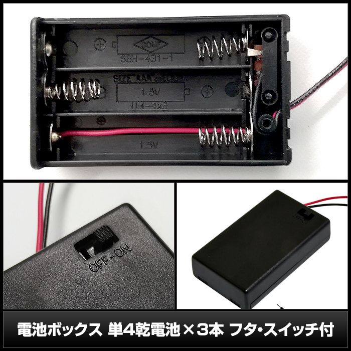型番:SBH-431-1AS 対応電池:単4×3本 ケーブル規格:AWG26 出力:赤黒ケーブル(赤がプラス・黒がマイナス) フタ:あり スイッチ:スライドスイッチ 重量(本体):約19g | |