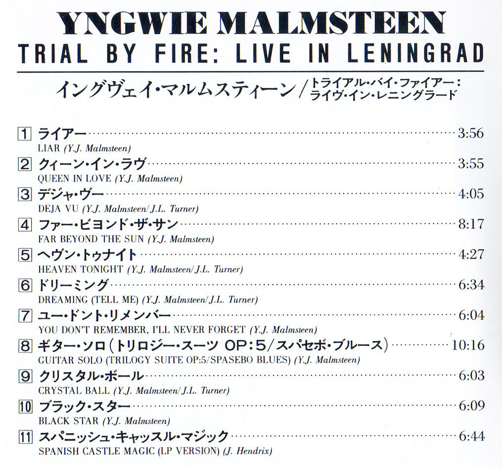迅速な取引を行うためオークション終了後48時間以内に取引ナビにて手続きを開始して下さい。 ※取引メッセージの投稿は手続きとみなしません。 手続き頂けない場合は落札者都合で削除いたします。 また、商品説明や注意事項、自己紹介欄等をしっかり熟読した上での入札をお願いいたします。 出品者の立場を理解せず不必要なメッセージのやり取りをしようとする方、マイルールを押し付ける方の入札は一切お断りです。過去の評価についてもしっかりご覧下さい。 オークション代行業者の方へ入札頂くのは構いませんが商品の管理に必要だとの理由でIDを記載してくれとの要求がありますがご自身のビジネス管理を丸投げする行為には一切応じませんのでご了承の上、入札下さい。 入札される方は自己紹介欄をご覧下さい←簡単な取引の流れを記載しておりますのでクリックして読んで下さいませ。 ≪商品詳細≫89年2月、光速を超えたギタリストにソ連が燃えた。ジョー・リン・ターナー参加。(帯タタキから) YNGWIE MALMSTEEN(イングヴェイ・マルムスティーン)が1989年にリリースしたライヴ・アルバム「Trial By Fire:Live In Leningrad/トライアル・バイ・ファイアー:ライヴ・イン・レニングラード」国内盤帯付CDです。 ※出品CDは1994年に来日記念盤として再発売されたものです。 バンドラインナップ Joe Lynn Turner(Vocals) ※RAINBOW~DEEP PURPLE Yngwie Malmsteen(Guitar) ※STEELER~ALCATRAZZ Barry Dunaway(Bass) Jens Johansson(Keyboards) ※SILVER MOUNTAIN~STRATOVARIUS Anders Johansson(Drums) ※SILVER MOUNTAIN~HAMMERFALL YNGWIE MALMSTEEN(イングヴェイ・マルムスティーン)のオフィシャル・サイトです←クリック ≪盤質≫小さい傷はありますが再生確認上、特に問題ありません ≪ジャケ等≫帯背に色褪せ・トレーによる挟み痕、ブックレットに捲りヨレ ≪備考≫ポリドール POCP-2313(税込1,800円/税抜価格1,748円)、帯、歌詞・対訳、解説付 ≪収録曲目≫ 1. ライアー 2. クィーン・イン・ラヴ 3. デジャ・ヴー 4. ファー・ビヨンド・ザ・サン 5. ヘヴン・トゥナイト 6. ドリーミング 7. ユー・ドント・リメンバー 8. ギター・ソロ(トリロジー・スーツOP:5/スパセボ・ブルース) 9. クリスタル・ボール 10. ブラック・スター 11. スパニッシュ・キャッスル・マジック(LPヴァージョン) 以上、全11曲収録 |