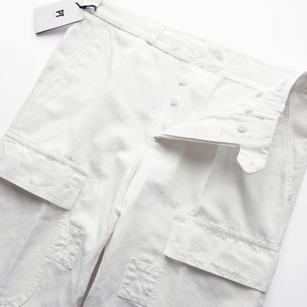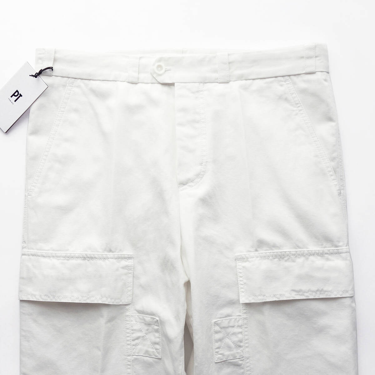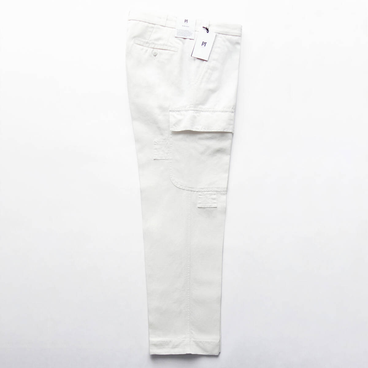 ご紹介するのは、「THE DESIGNER(デザイナー)」と名付けられた“カーゴパンツ”になります。ミリタリーパンツの王道を行くカーゴパンツですが、PTの手に掛かればご覧のとおり。本格的なテーラード仕立てを採用し、緩やかにテーパードを効かせた美脚効果の高いセミワイドシルエットをインプットすることで、カーゴパンツ本来の男らしさを損なうことなくカジュアルからモードまで合わせられるニュートラルなバランスを実現しています。滑らかな曲線を描くマチなしカーゴポケットやクロスステッチが施された別布補強、股部分のガゼットクロッチ、裾内側の靴擦れ布などのディテールが絶好のアクセントになって、このパンツを唯一無二のものにしています。ユルさ加減がちょうどいい今どきのフィッティングですが、膝下から裾へかけて緩やかにテーパードするPTならではの緻密に計算された設計になっているので、ゆとりがあるのにもたつかず、実際に穿くとすっきりと洗練されて見えます。若者が穿いている太めのカーゴパンツとの違いは一目瞭然。生地の上質感やシルエットの美しさがまるで違います。カジュアルスタイルはもちろん、ジャケットスタイルのハズシにも使える大人専用のカーゴパンツゆえ、期待以上の働きをしてくれると思います。