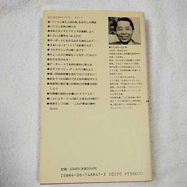 パソコン恐怖症の人に、キーボードのさわり方から、たし算“1+1=2”と、日の丸“丸と四角を描く”二大目的。データベース・ソフトによる、住所録作成とラベル印刷。初心者の気持を考え、画面変化を逐一追いながら解説。