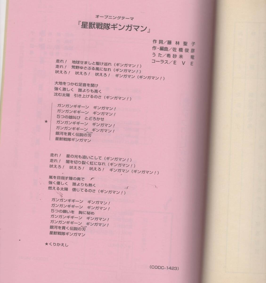 1998年2月22日から1999年2月14日まで、テレビ朝日系で全50話が放映された特撮ドラマ『星獣戦隊ギンガマン』の、第17話の完成台本(決定稿)です。 中盤に差し掛かるストーリーで外して語れない、新しいキャラクターの登場エピソードです。ギンガレッド・リョウマをバルバンの罠から救ってくれた謎の戦士。全身を漆黒の甲冑に身を包んだ「黒騎士」です。 ◇商品の詳細 ●B5サイズ。 ●使用品。※当時の台本ですので経年による紙質の変化や小さな傷みがあるかもしれませんが、状態はおおむね良いと思います。 ●書き込みはありません。 【タイトル】『星獣戦隊ギンガマン』 【放送日】第17章(6月14日放送予定)「優しい勇気」(仮題) →改題「第十七章 本当の勇気」 【制作】テレビ朝日、東映、東映エージエンシー 【総尺】30分 【STAFF】 ・原作:八手三郎 ・プロデューサー:太田賢司(テレビ朝日)、?寺成紀(東映)、矢田晃一(東映エージエンシー) ・脚本:小林靖子、武上純希、荒川稔久、きだつよし、沖田徹男、村山桂 ・監督:田?竜太、辻野正人、長石多可男、小中肇、諸田敏 ・特撮監督:佛田洋 ・アクション監督:竹田道弘(ジャパンアクションクラブ)、新堀和男(レッドアクションクラブ) ・音楽:佐橋俊彦 ・撮影:いのくままさお、大沢信吾 ・制作:テレビ朝日、東映、東映エージエンシー 【CAST】 ・リョウマ/ギンガレッド:前原一輝 ・ハヤテ/ギンガグリーン:末吉宏司 ・ゴウキ/ギンガブルー:照英 ・ヒカル/ギンガイエロー:高橋伸顕 ・サヤ/ギンガピンク:宮澤寿梨 ・ヒュウガ:小川輝晃 水谷ケイ、高杢禎彦、早川翔吾ほか | ||