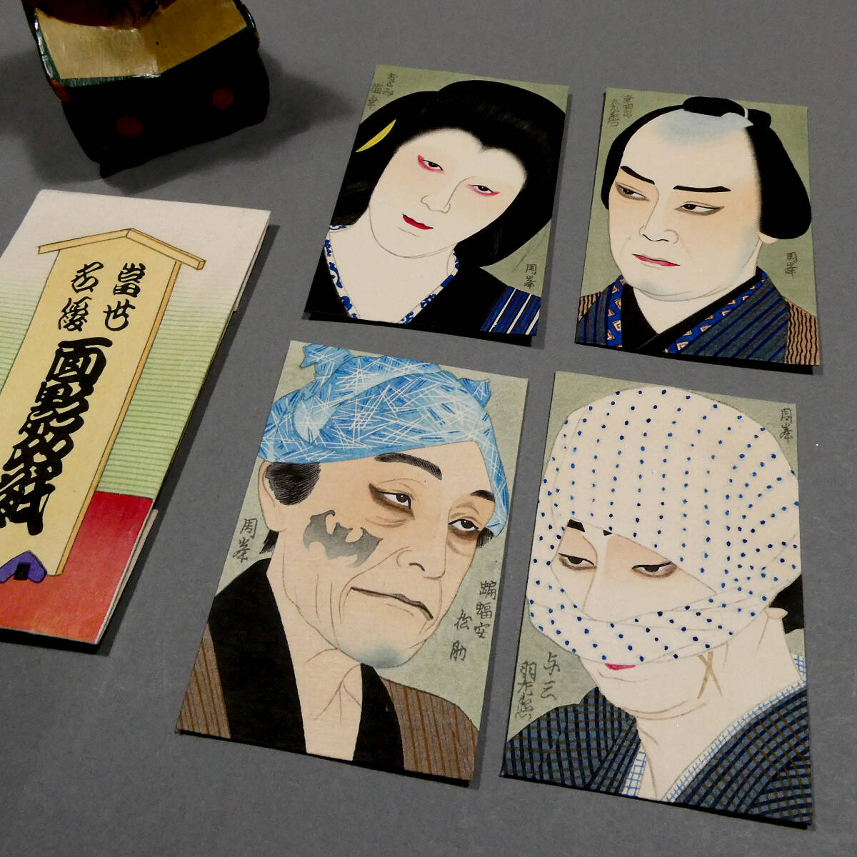 ■ 戦前 木版色摺り ポチ袋 4点入り 神下周峯画 「当世名優 面影双紙」 包み付き 歌舞伎 役者絵 ■