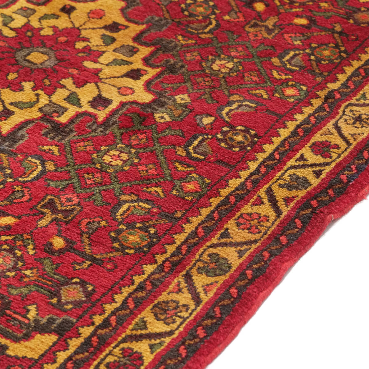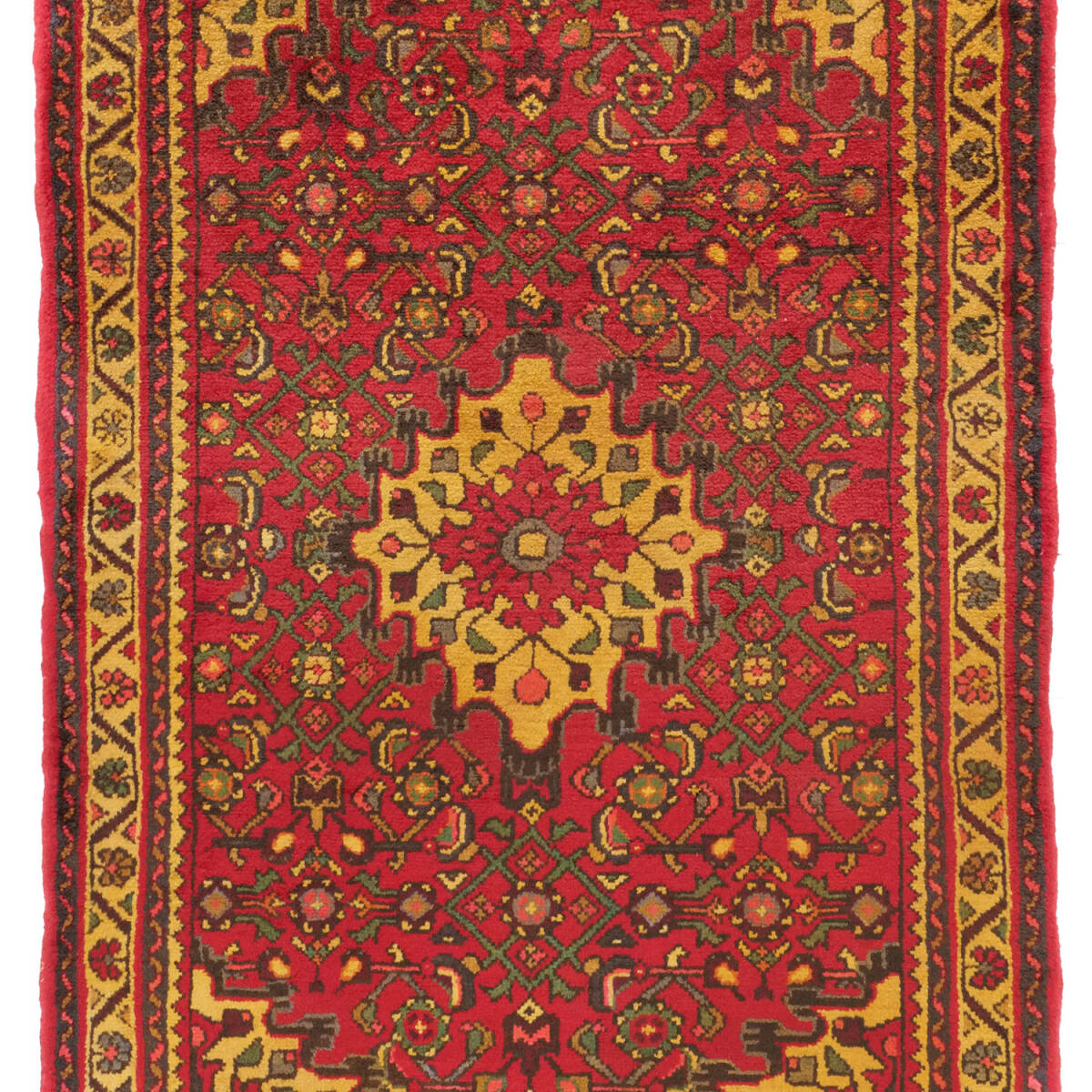 中央にメダリオンを据え、花文様と蔓草文が全体に広がる伝統構図。ハマダン地方の豊かな装飾美を表現した、装飾性の高いセミアンティーク作品です。状態も良好で、クラシカルな空間づくりに最適です。