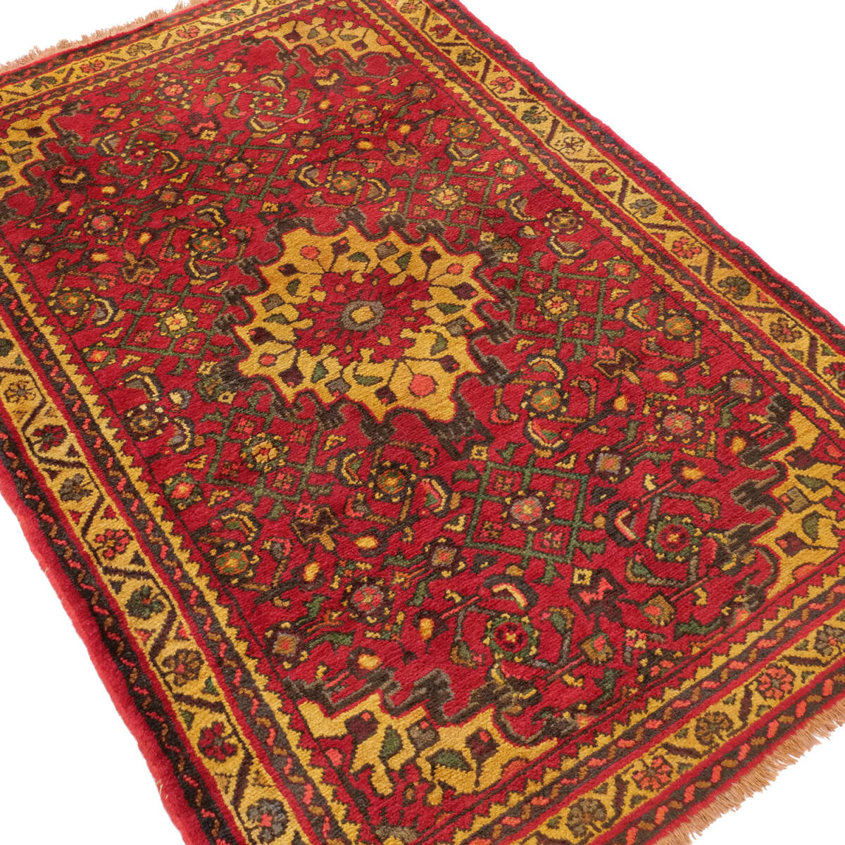 1970年代に制作されたハマダン産のセミアンティークラグです。中央に花形のメダリオンを配し、その周囲には蔓草や花文が精緻に織り込まれています。伝統的なハマダン絨毯らしい華やかな構図で、古典的なペルシャの美を感じさせる一枚です。