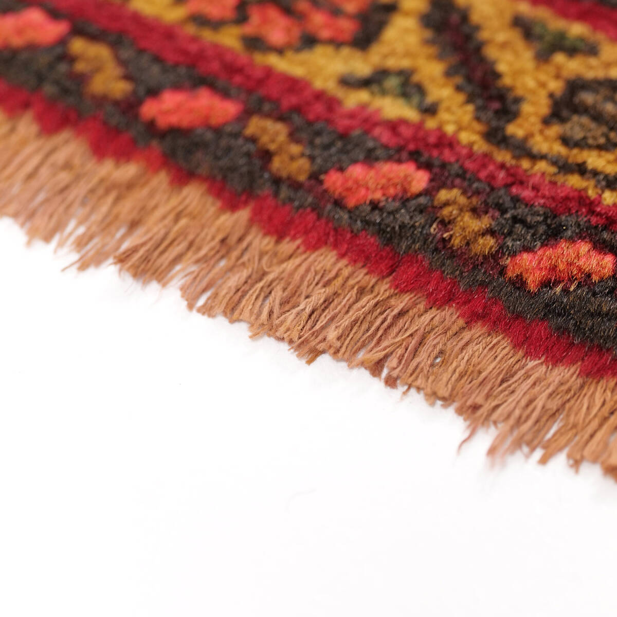 赤を基調とした色彩に、黄と緑が調和しており、落ち着きの中にも生命力を感じさせます。しっかりとした織りとやや厚みのある質感が特徴で、足触りも柔らかく、実用性と装飾性を兼ね備えています。