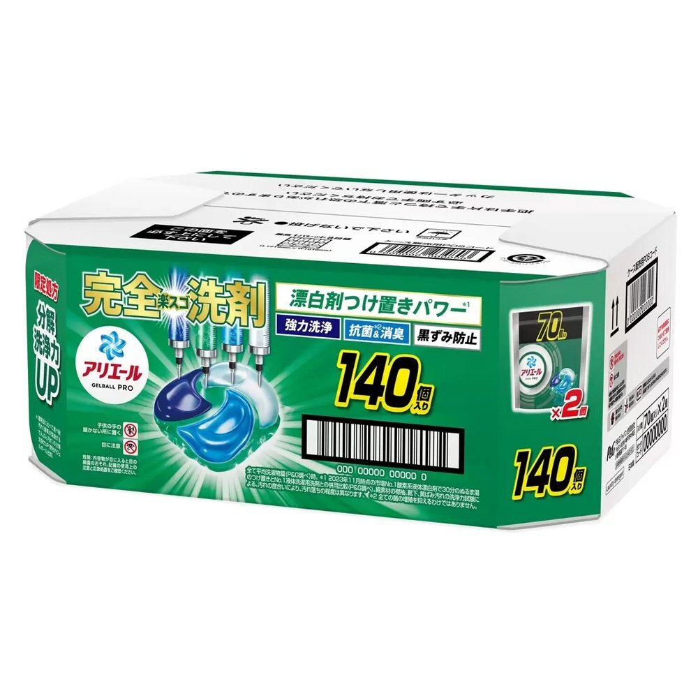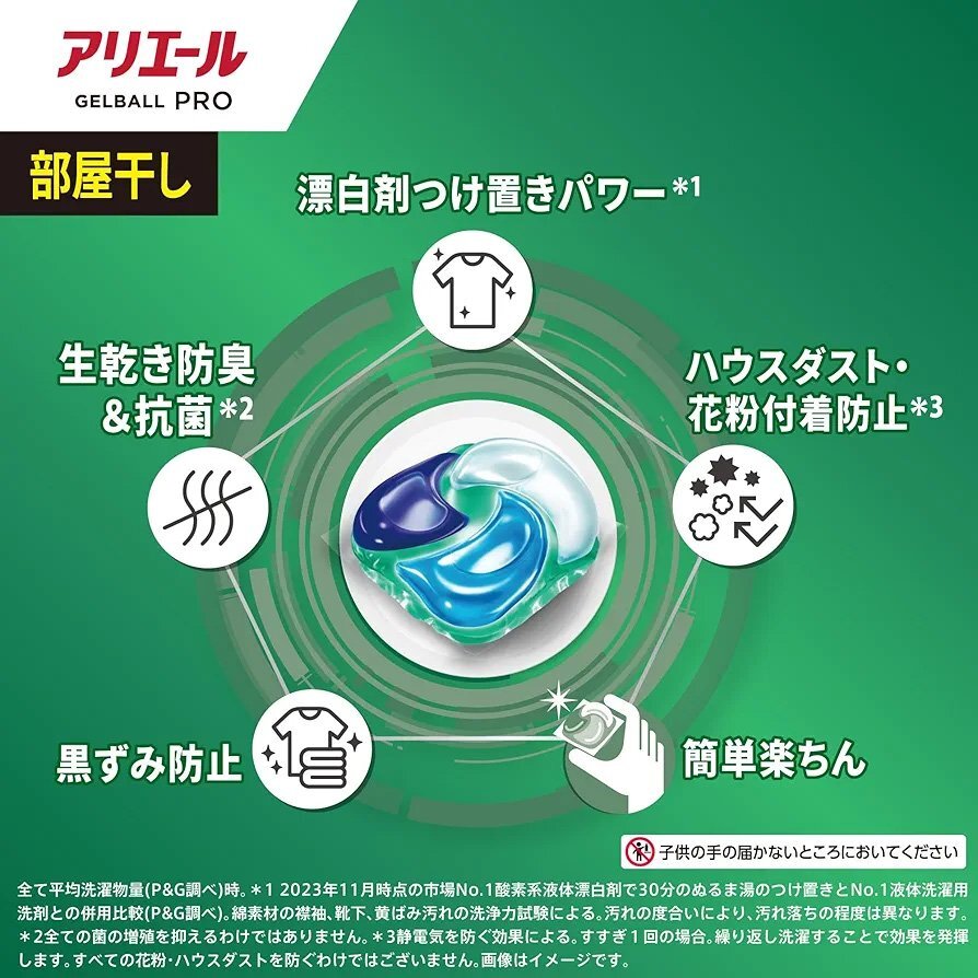 アリエール GELBALL PRO 部屋干し x 鉄壁バリア*1。NEW 完全楽スゴ洗剤4層パワー! 漂白剤つけ置きパワー*2 生乾き防臭&抗菌*3 ハウスダスト・花粉付着防止*4 黒ずみ防止 簡単楽ちん 洗濯槽のカビ防止 ドラム式・自動投入式・すすぎ1回・まとめ洗いOK *1 汚れ・ニオイの蓄積を防ぐ。 *2 2023年11月時点の市場No.1酸素系液体漂白剤で30分のぬるま湯のつけ置きとNo.1液体洗濯用洗剤との併用比較(P&G調べ)。 綿素材の襟袖、靴下、黄ばみ汚れの洗浄力試験による。汚れの度合いにより、汚れ落ちの程度は異なります。 *3 全ての菌の増殖を抑えるわけではありません。 *4 静電気を防ぐ効果による。 すすぎ1回の場合。 繰り返し洗濯することで効果を発揮します。 すべての花粉・ハウスダストを防ぐわけではございません。 アリエール 洗濯洗剤 ジェルボール プロ 部屋干し×鉄壁バリア 部屋干しでもさわやかな香り |