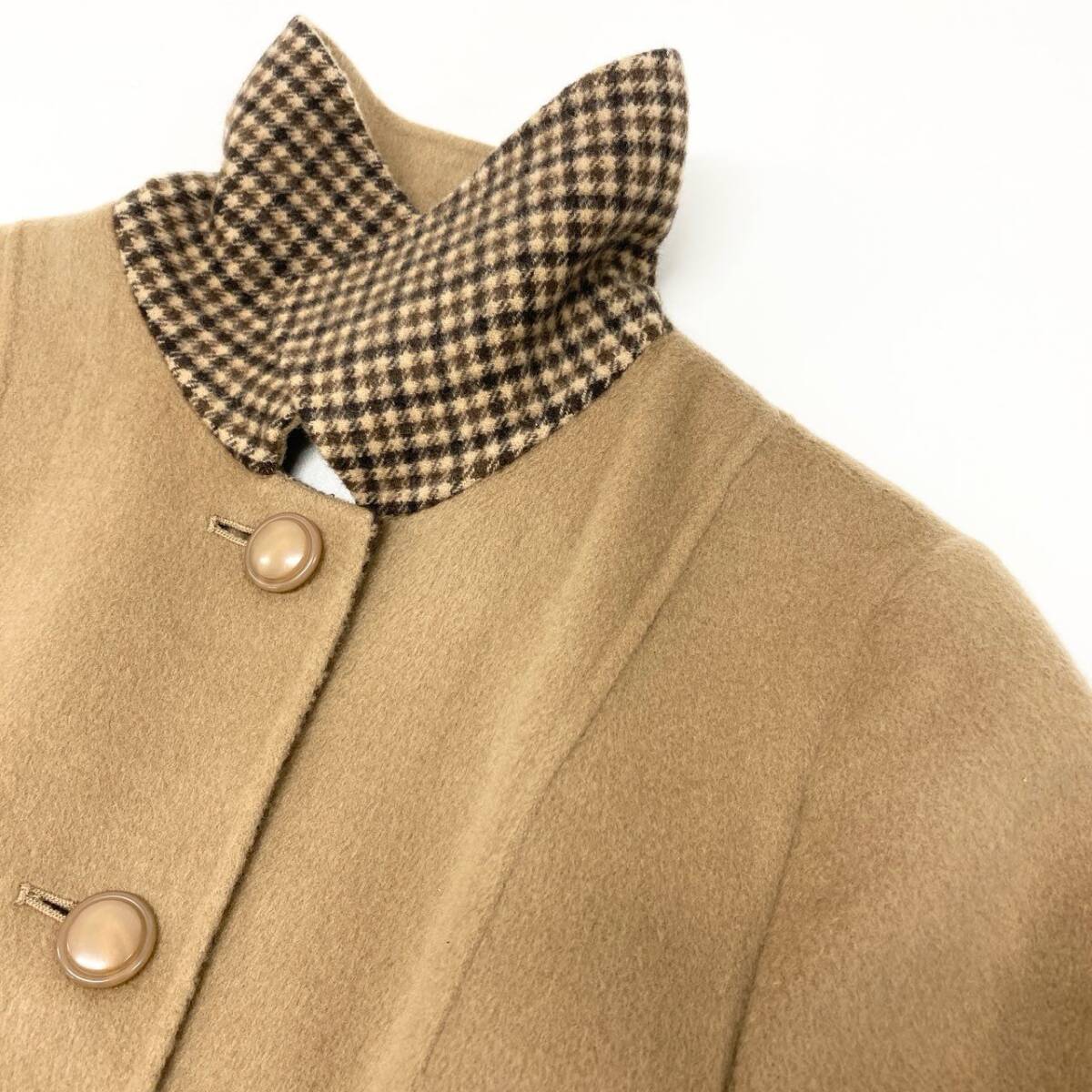 | スタッフ商品コメント | レリアンの上質なカシミヤ100%を使用した、柔らかく暖かいステンカラーコートです。落ち着いたキャメルベージュに、切替部分のさりげないチェック柄がクラシックで上品な印象をプラス。軽やかな着心地ながらしっかり防寒でき、通勤からお出かけシーンまで幅広く活躍します。ボタンは丸みのあるシンプルデザインで、長く愛用できるタイムレスな一着です。 |