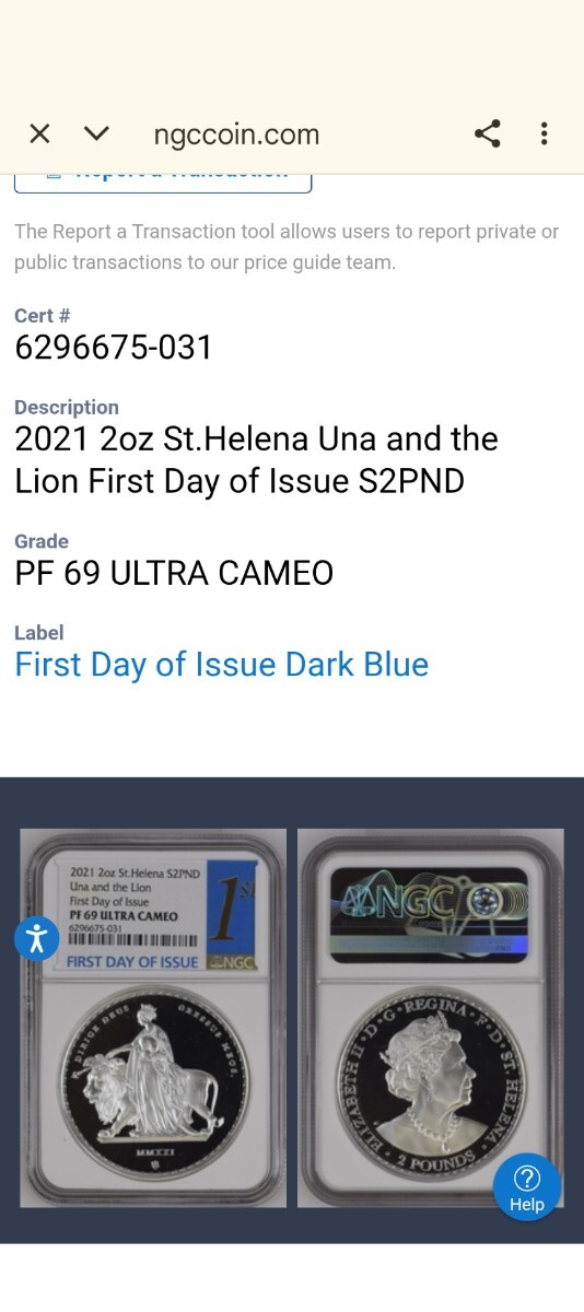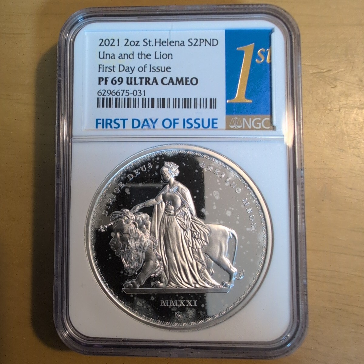 2021年セントヘレナ発行の「ウナとライオン」2ポンド2オンス銀貨(PF69UCAM鑑定)に関する情報は以下の通りです。