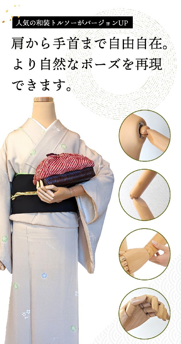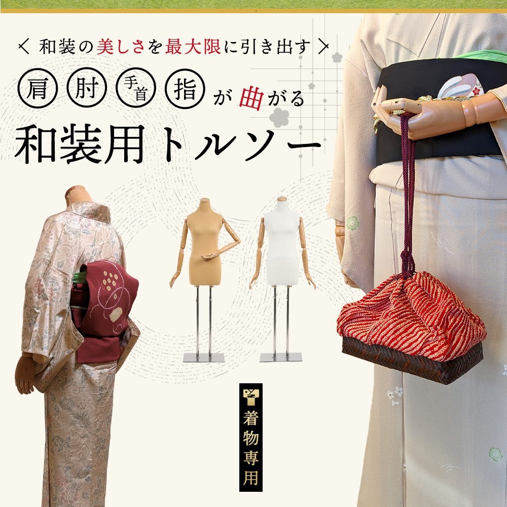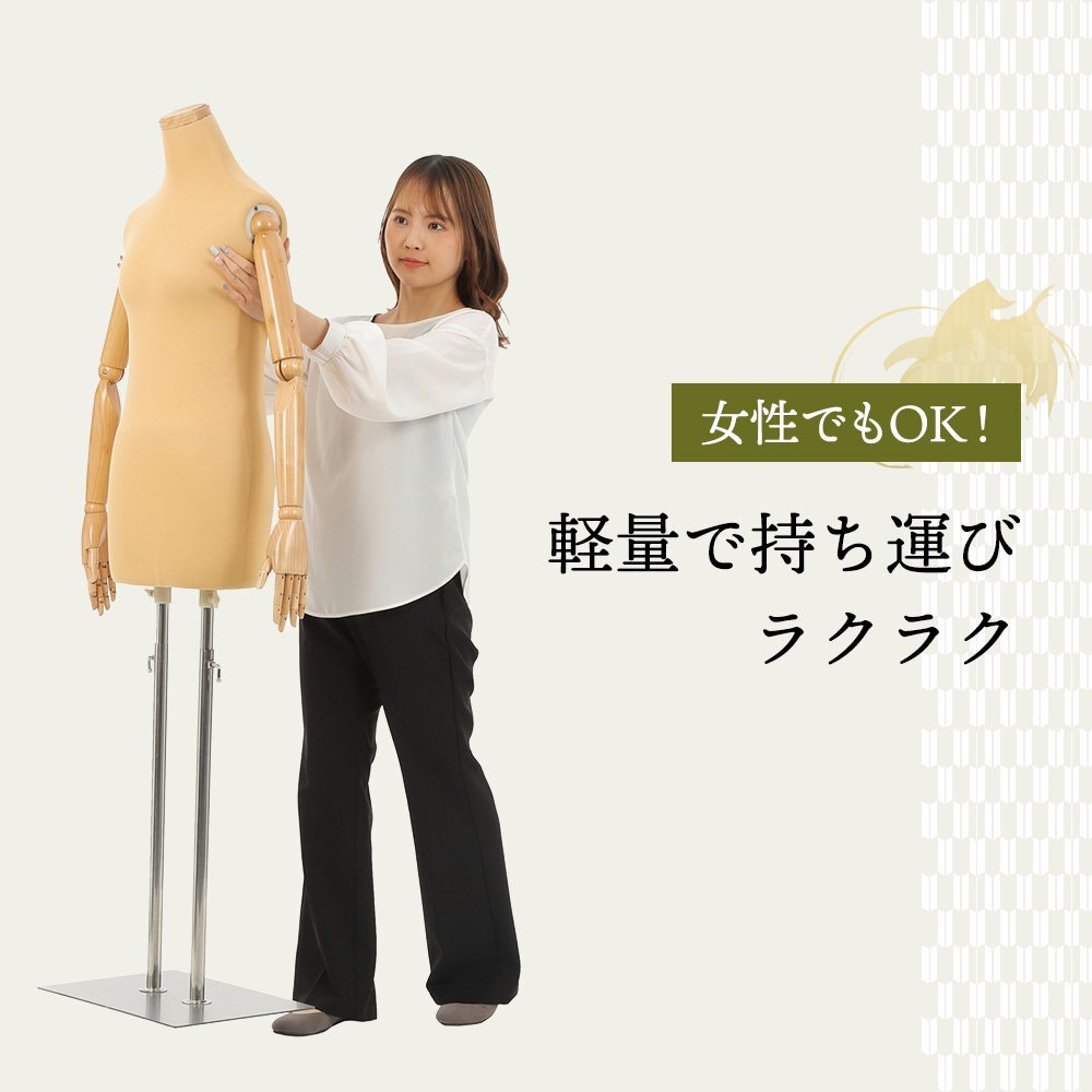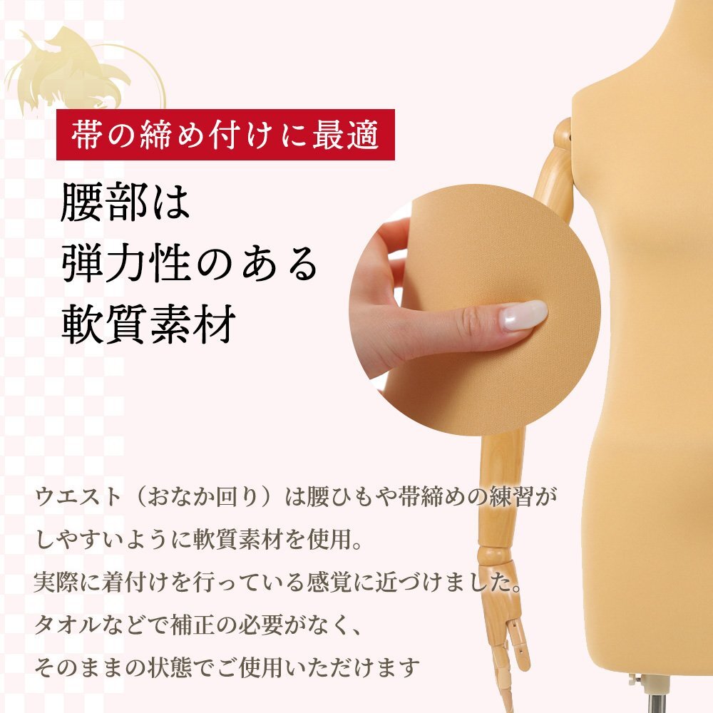 指付き、腕付きタイプの登場です。 ウエスト(おなか回り)に弾力を持たせ、 実際に着付けを行っている感覚に近づけました。 腕は人気のフレキシブルタイプです。 また、2本の脚(ポール)が着付け時の 安定感を保ちます。 バスト:81cm ウエスト74cm: ヒップ : 86cm 全備重量約7.5kg 高さ調整可能120~170cm ピンワークも可能です |