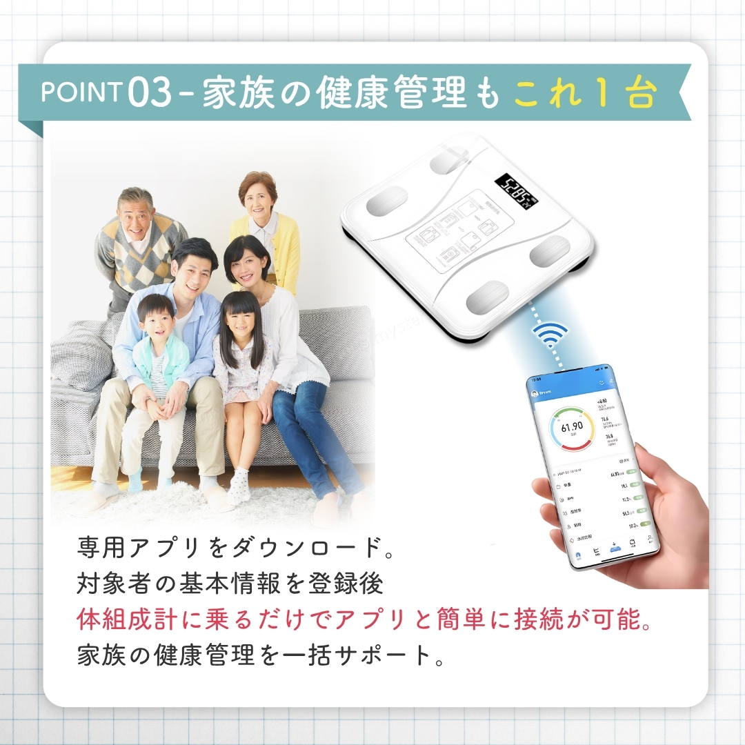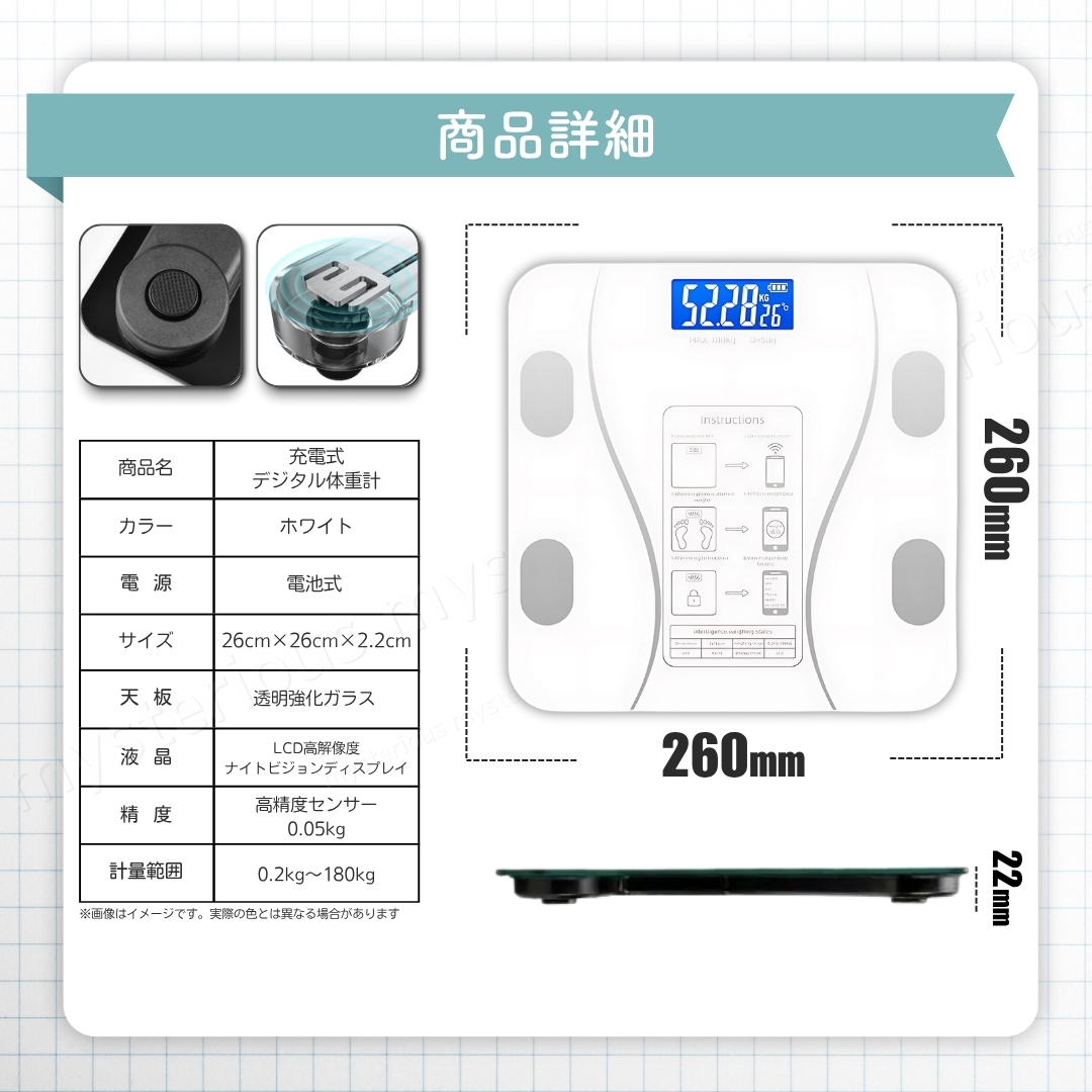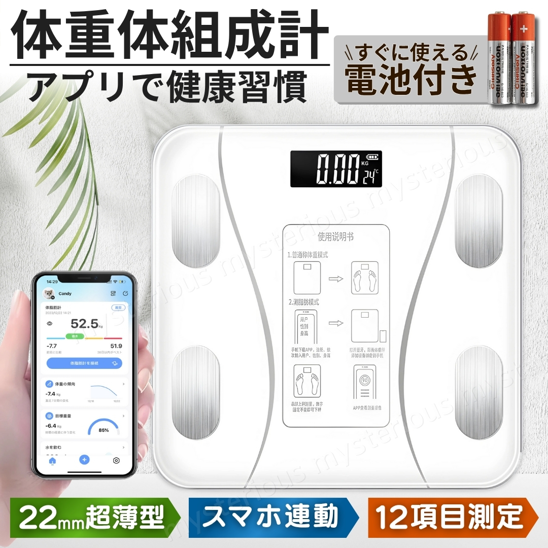 日々の健康管理やダイエットをサポート。 【スマホ連動型 Bluetooth 体組成計】です。 付属の電池を入れ、アプリをダウンロード。 その日からすぐにご使用いただけます。 面倒な操作も不要で、測定もデータ管理も簡単。 日々の健康維持にしっかり役立ちます。 ① 自動電源ON/OFF 足を乗せればすぐ測定開始、降りると約10秒後に自動OFF。 ② LCD高解像度ナイトディスプレイ 暗い場所でもはっきり見やすく、電池残量と室温も確認可能。 ③ 強化ガラス採用の薄型デザイン 最大180kgまで測定可能。滑り止め付きで安心、コンパクトで持ち運び・収納もラクラク。 ④ 電池式で安心 突然故障の多いUSB給電ではなく、信頼性の高い電池式。 電池残量も表示されるので安心して長く使えます。 ⑤ 12種類の健康データを測定 1.体重 2.BMI 3.体脂肪率 4.脂肪量 5.筋肉量 6.筋肉比率 7.骨格筋量 8.骨格筋率 9.内臓脂肪 10.基礎代謝 11.水分量 12.水分率 複数人利用できるので家族みんなでアカウント登録し、健康管理を共有できます。 【仕様】 ■カラー:ホワイト ■サイズ:約260×260×22mm ■重量:約850g ■天板素材:強化ガラス ■表示方式:LCD高解像度ナイトディスプレイ ■電源:単4電池×2(付属) ■測定範囲:0.2~180kg 【セット内容】 ■本体 ×1個 ■単4電池 ×2本 ■QRコード付き取扱説明書(外国語) 【支払いについて】 !かんたん決済 【配送について】 ■日本郵便のおてがる配送日本郵便にて発送になります。 ■離島の方につきましては商品到着までにお時間を要する場合がございます。 ■発送業務は平日のみになります。 【注意事項】 ■細かな部分の作りが甘い場合や、工程上でできる多少の傷や汚れがある場合があります。 ■購入者様のご都合によるご返品は受付ができません。(サイズが合わない、イメージと違う等...) ■検品を行って配送をしておりますが、万が一不良品があった場合は、評価前にメッセージにてご連絡ください。 評価後の対応は致しかねますのでご注意ください。 【お願い】 ■商品画像の転載や説明文のコピーはお止め下さい 。 ※見つけたら通報しています