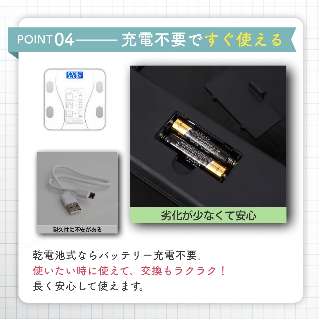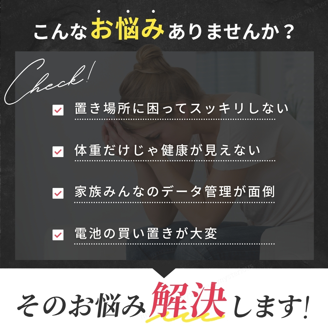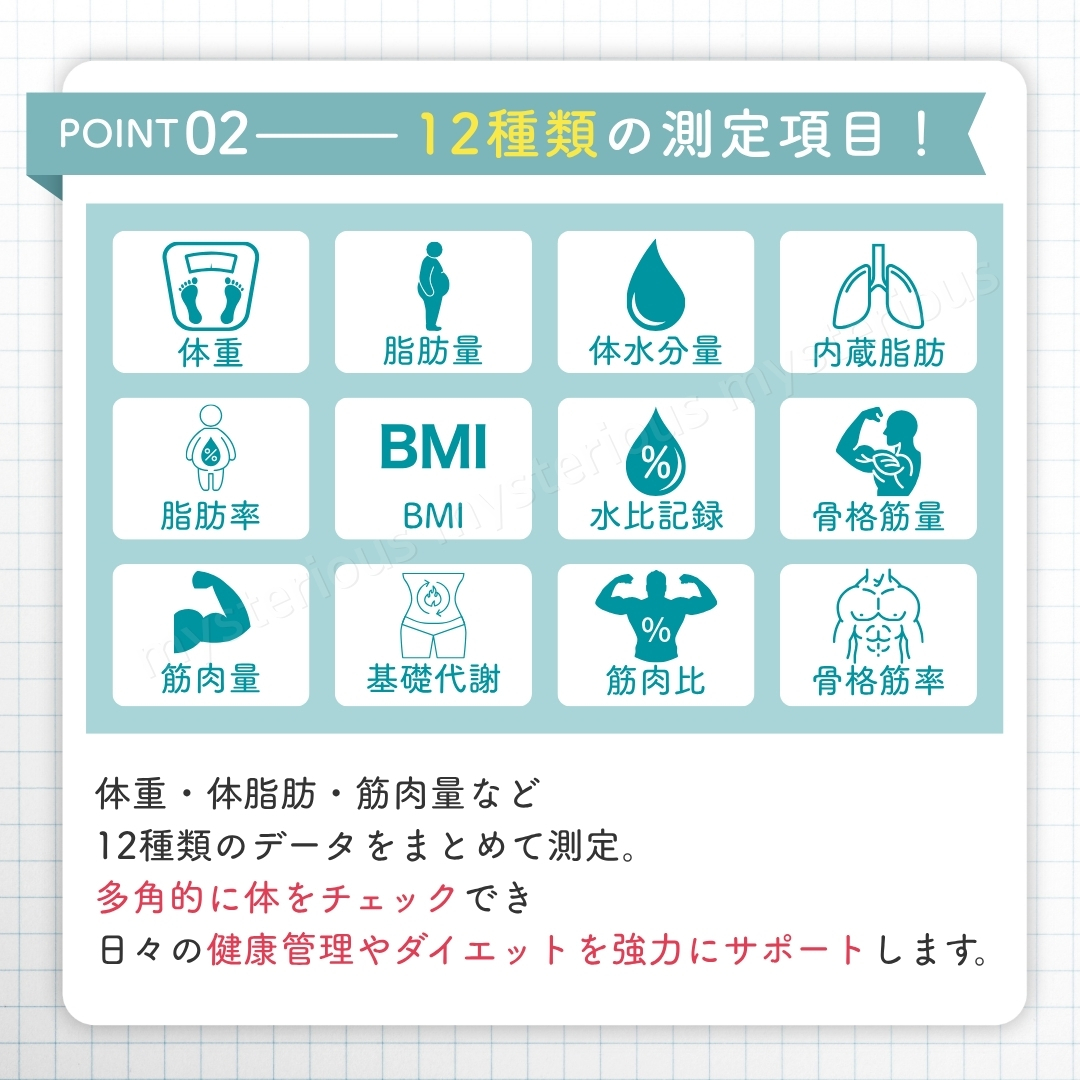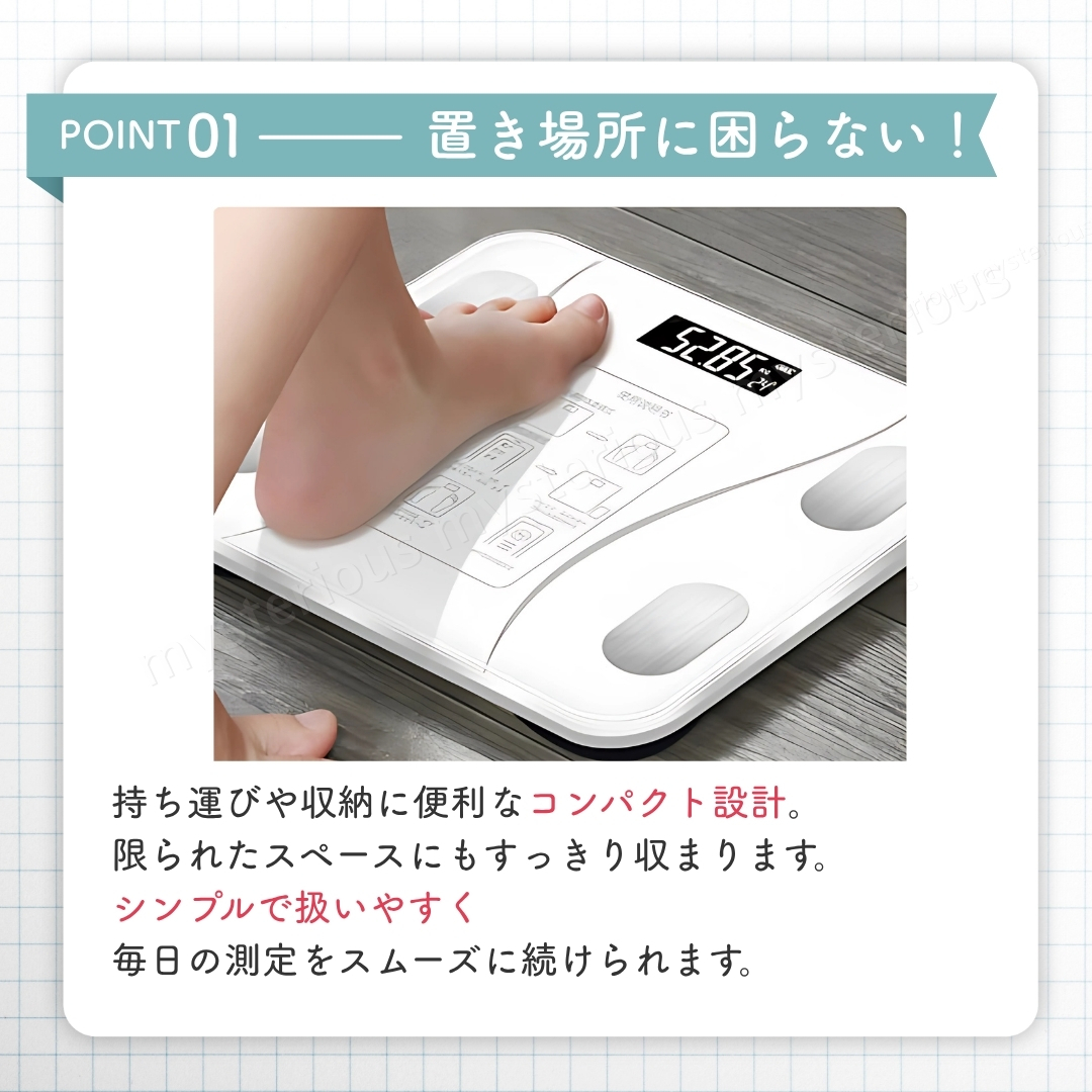 日々の健康管理やダイエットをサポート。 【スマホ連動型 Bluetooth 体組成計】です。 付属の電池を入れ、アプリをダウンロード。 その日からすぐにご使用いただけます。 面倒な操作も不要で、測定もデータ管理も簡単。 日々の健康維持にしっかり役立ちます。 ① 自動電源ON/OFF 足を乗せればすぐ測定開始、降りると約10秒後に自動OFF。 ② LCD高解像度ナイトディスプレイ 暗い場所でもはっきり見やすく、電池残量と室温も確認可能。 ③ 強化ガラス採用の薄型デザイン 最大180kgまで測定可能。滑り止め付きで安心、コンパクトで持ち運び・収納もラクラク。 ④ 電池式で安心 突然故障の多いUSB給電ではなく、信頼性の高い電池式。 電池残量も表示されるので安心して長く使えます。 ⑤ 12種類の健康データを測定 1.体重 2.BMI 3.体脂肪率 4.脂肪量 5.筋肉量 6.筋肉比率 7.骨格筋量 8.骨格筋率 9.内臓脂肪 10.基礎代謝 11.水分量 12.水分率 複数人利用できるので家族みんなでアカウント登録し、健康管理を共有できます。 【仕様】 ■カラー:ホワイト ■サイズ:約260×260×22mm ■重量:約850g ■天板素材:強化ガラス ■表示方式:LCD高解像度ナイトディスプレイ ■電源:単4電池×2(付属) ■測定範囲:0.2~180kg 【セット内容】 ■本体 ×1個 ■単4電池 ×2本 ■QRコード付き取扱説明書(外国語) 【支払いについて】 !かんたん決済 【配送について】 ■日本郵便のおてがる配送日本郵便にて発送になります。 ■離島の方につきましては商品到着までにお時間を要する場合がございます。 ■発送業務は平日のみになります。 【注意事項】 ■細かな部分の作りが甘い場合や、工程上でできる多少の傷や汚れがある場合があります。 ■購入者様のご都合によるご返品は受付ができません。(サイズが合わない、イメージと違う等...) ■検品を行って配送をしておりますが、万が一不良品があった場合は、評価前にメッセージにてご連絡ください。 評価後の対応は致しかねますのでご注意ください。 【お願い】 ■商品画像の転載や説明文のコピーはお止め下さい 。 ※見つけたら通報しています