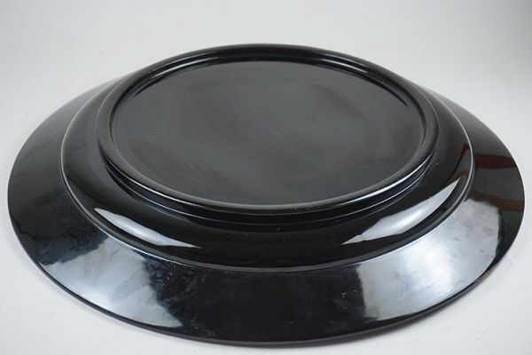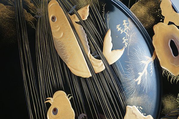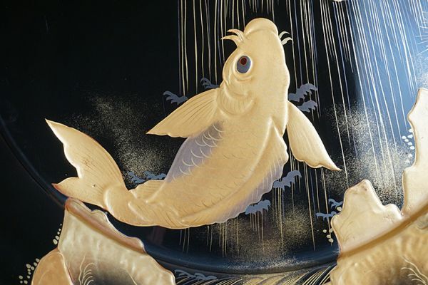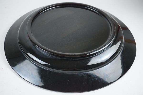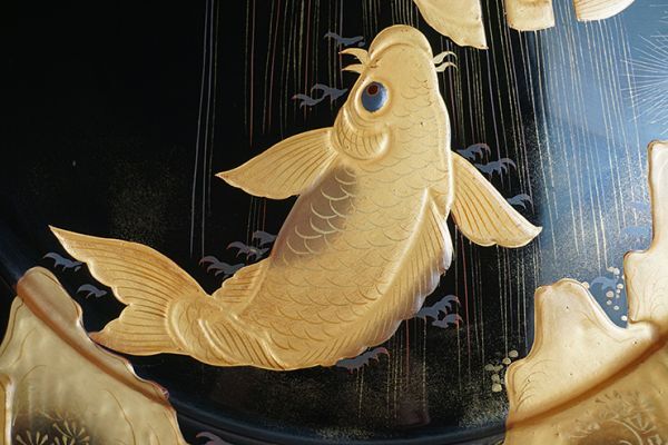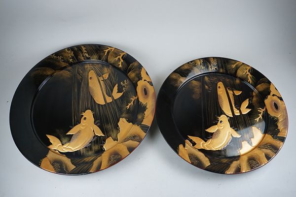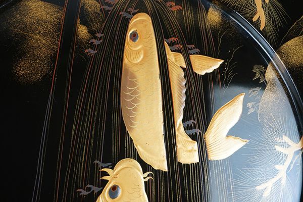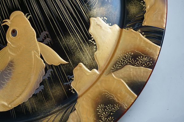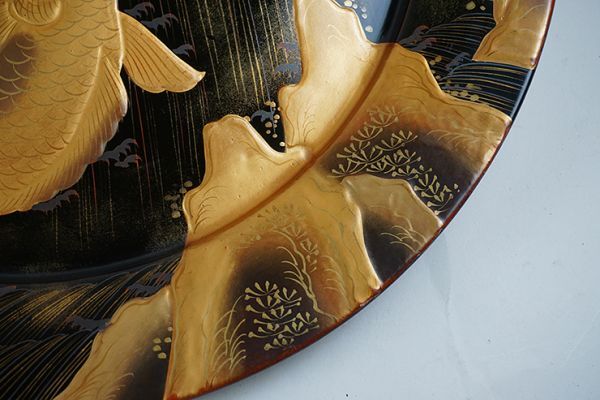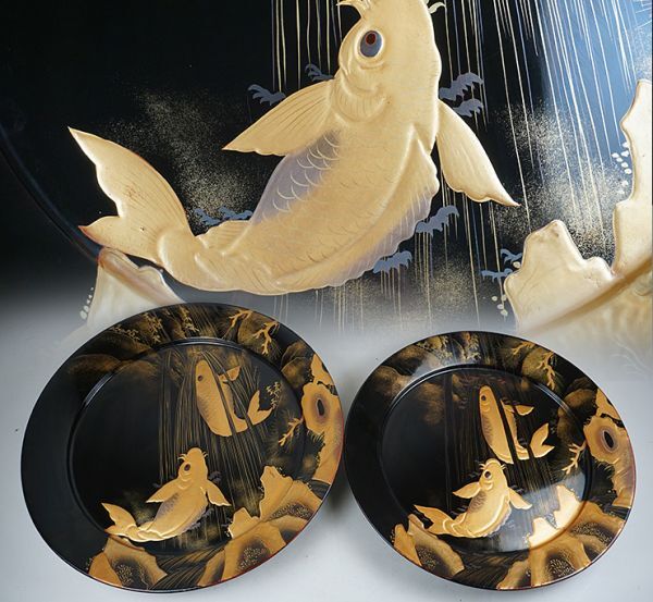 | D-364■時代伝統漆器 木製黒塗高蒔絵滝昇り鯉図 大皿 大小二枚 | ||