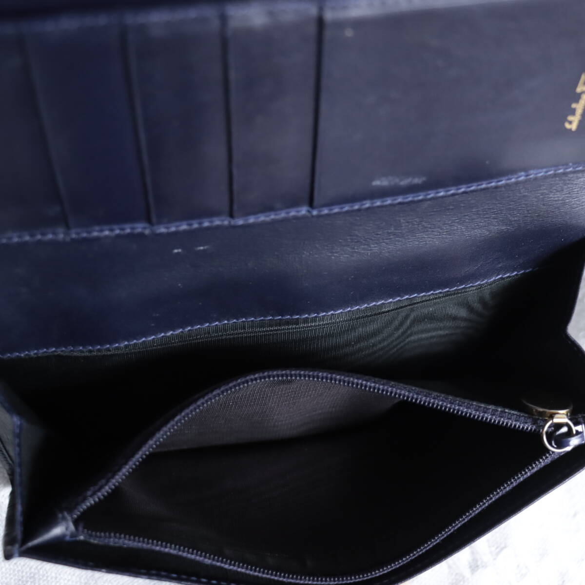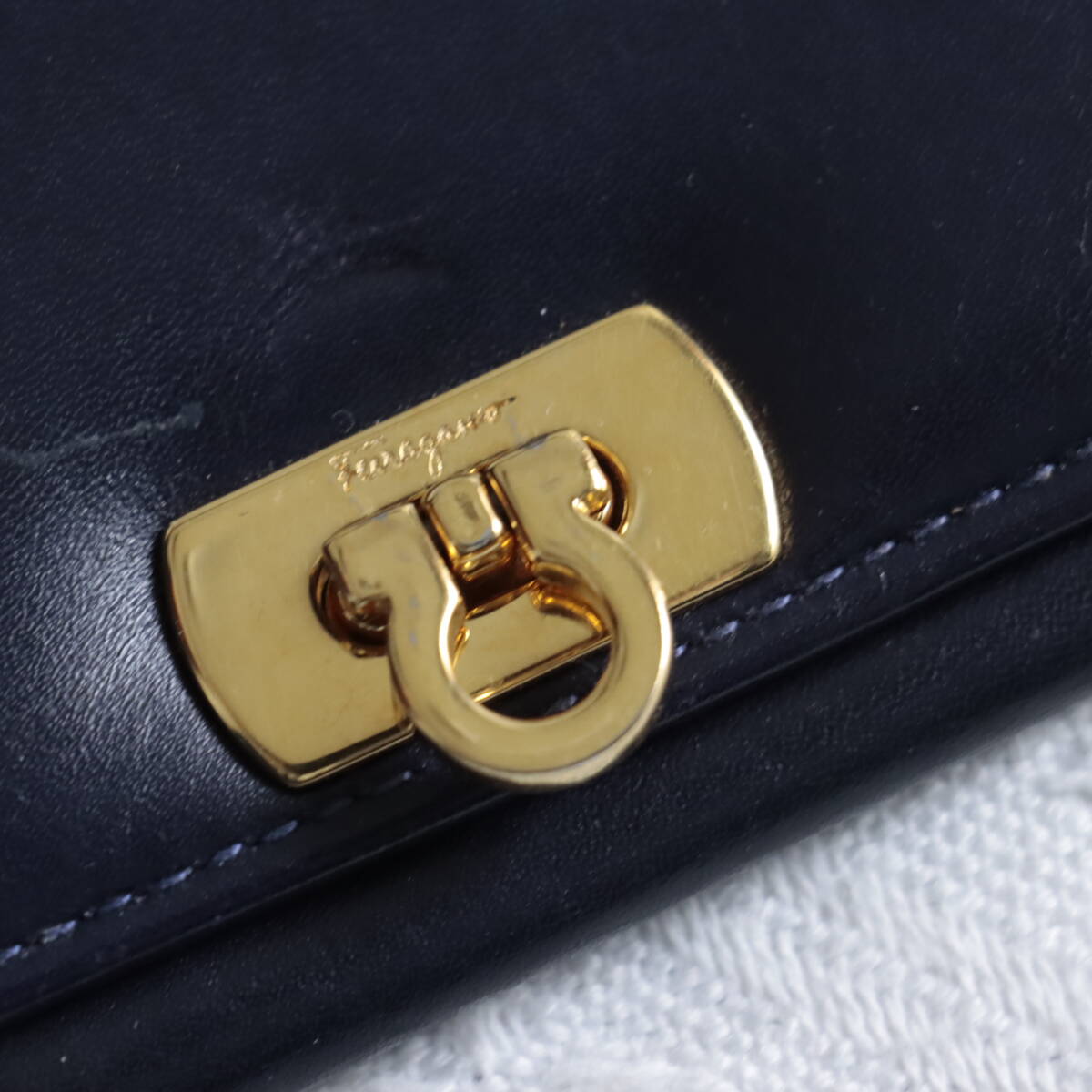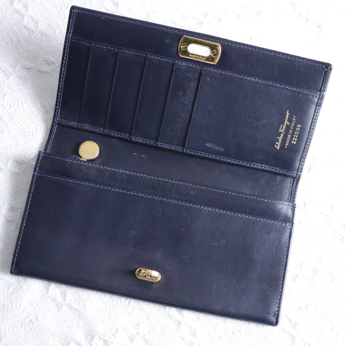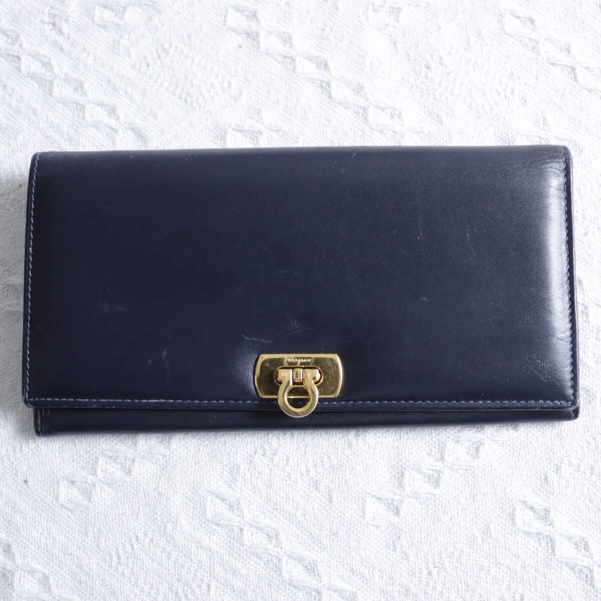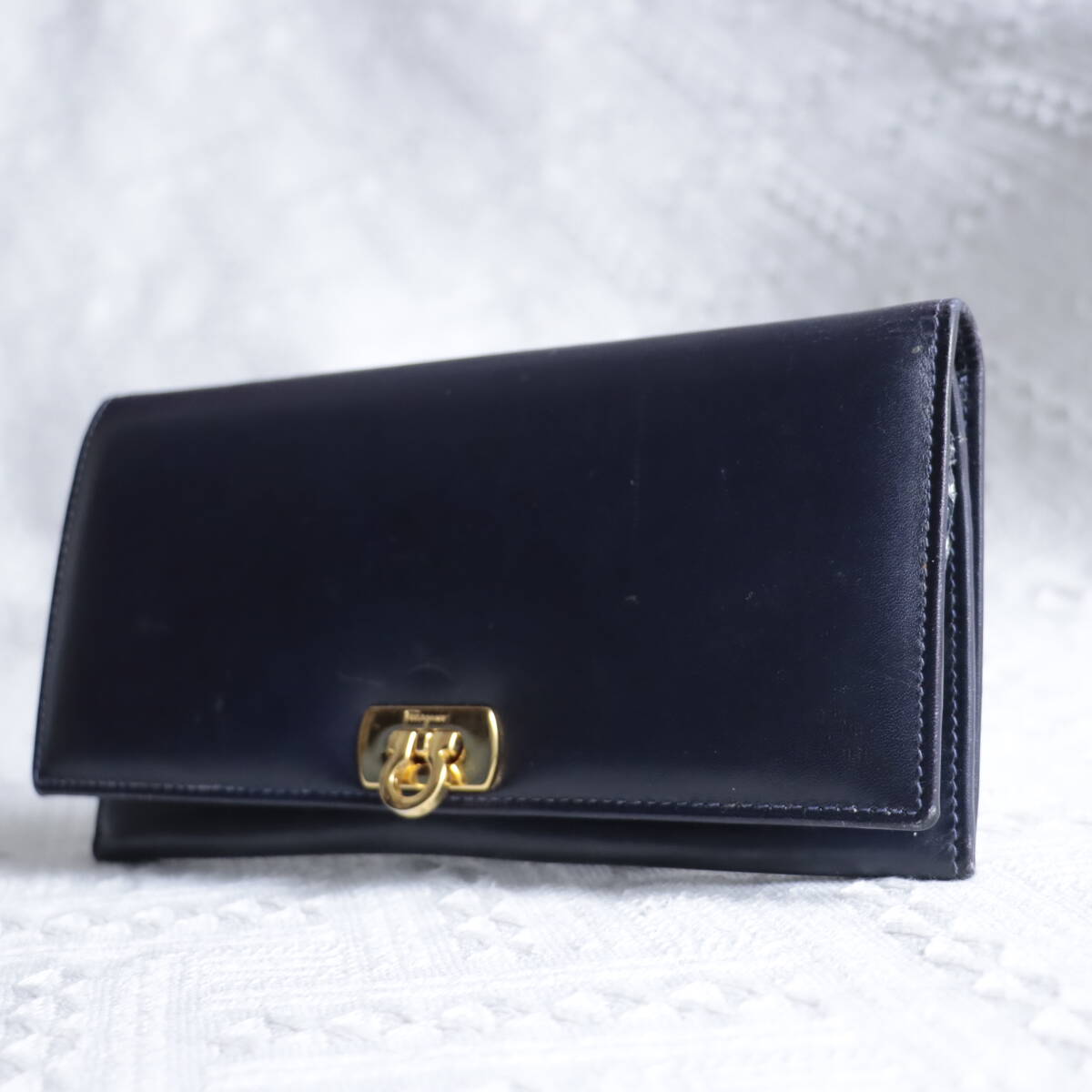 | 1円!【高級感!ゴールドガンチーニ】サルバトーレフェラガモ Feragamo 長財布 ロングウォレット ネイビー 紺色 レザー | ||